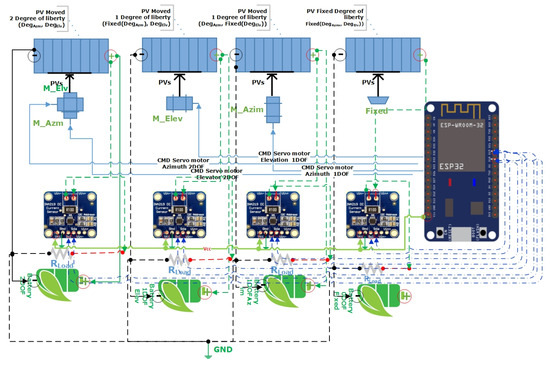 The first step consists of implementing four identical PV panels with different DOFs: 2DOF, 1DOF_Elev, 1DOF_Azim, and 0DOF. These panels are, afterwards, linked to current and voltage sensors (INA219) to convert the analog energy readings into digital data, subsequently processed by the ESP32 microcontroller. The latter manages the three sun path trackers, while the servo motors operate via the Arduino IDE platform.