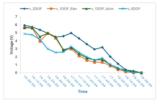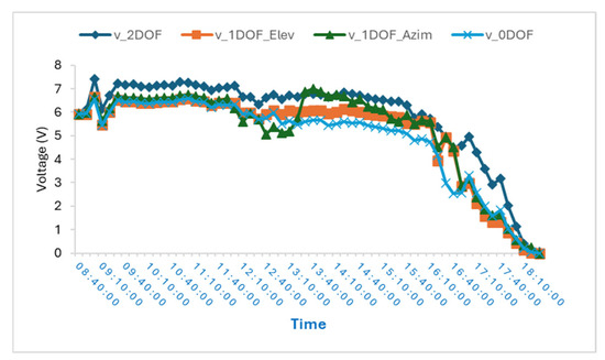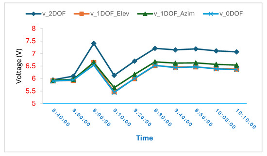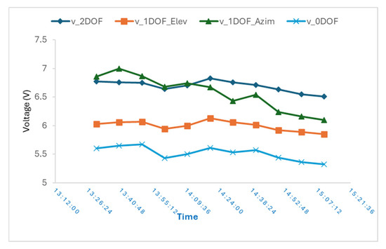 This study investigates the energy use of all components of each SPT system, a subject that has received limited attention in the literature. Accordingly, the total electrical energy consumed by the different wired electrical components of each iDOF system () can be estimated using Equation (7) and based on the outcomes of different measurements. This corresponds to the cumulative energy dissipated by all the elements constituting the electronic circuitry of the SPT system which are powered by photovoltaics, with the exception of the servo motors and the microcontroller, which are powered by external supplies. In fact, it corresponds to the sum of energies dissipated across the load resistor (ERL) and the shunt resistor (ERS); however, the latter can be neglected because of its low resistance as denoted in Table 5.
