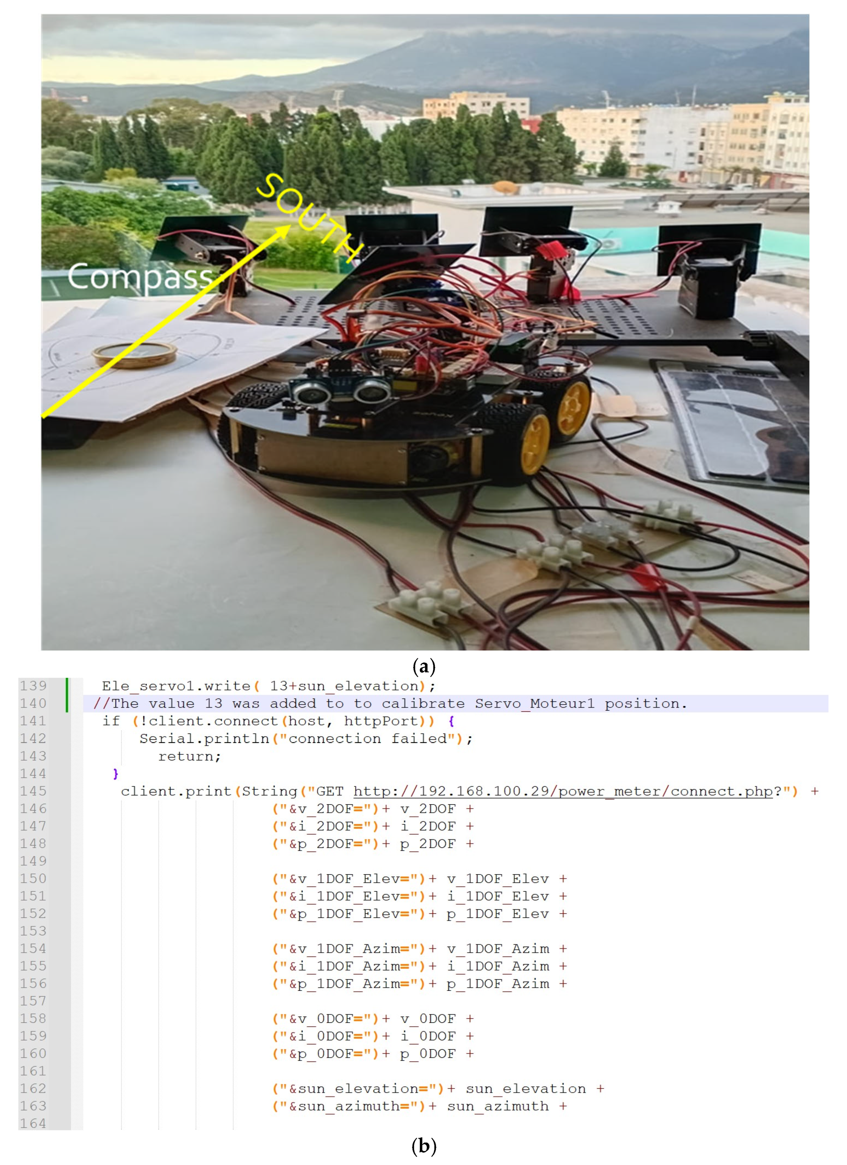 | Astronomical | Azimuth and Elevation: These astronomical values are calculated using Equations (1) and (2) and inserted into the Arduino IDE program and sent to local database, power_sunpathtracker_db, via connect.php file. | |