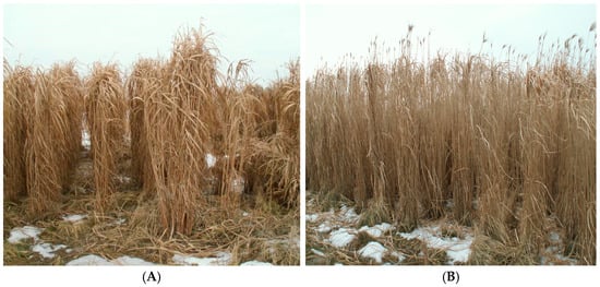 The energetic assessment of biomass from M. giganteus and M. sacchariflorus demonstrated that both species exhibit high calorific values comparable to other lignocellulosic feedstocks, such as Sida hermaphrodita (16.5–17.2 MJ·kg−1 d.m.) [], Phalaris arundinacea (17.5–18.2 MJ·kg−1 d.m.) [] and Miscanthus (17–18 MJ·kg−1 d.m.) [].
