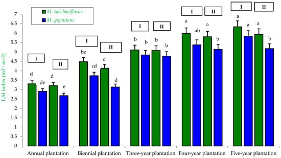 Average Leaf Area Index (LAI) of M. sacchariflorus and M. giganteus depending on the plantation age and habitat conditions. I—first location (Wilczyce—medium-heavy alluvial soil); II—second location (Krzyków—brown soil); Means followed by same letter do not significantly differ (p = 0.05, Tukey’s HSD).