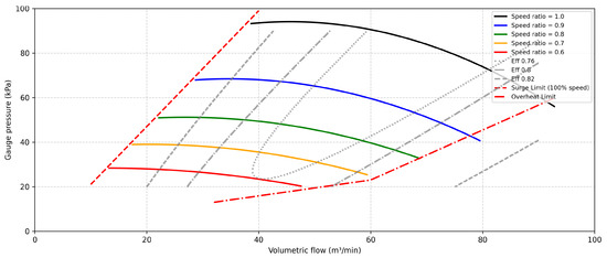 23]. In the present study, the blower model reproduces the head–flow–efficiency relationships from vendor curves and incorporates surge limits so that the subsequent optimization respects both efficiency range and stability constraints during parallel operation.
