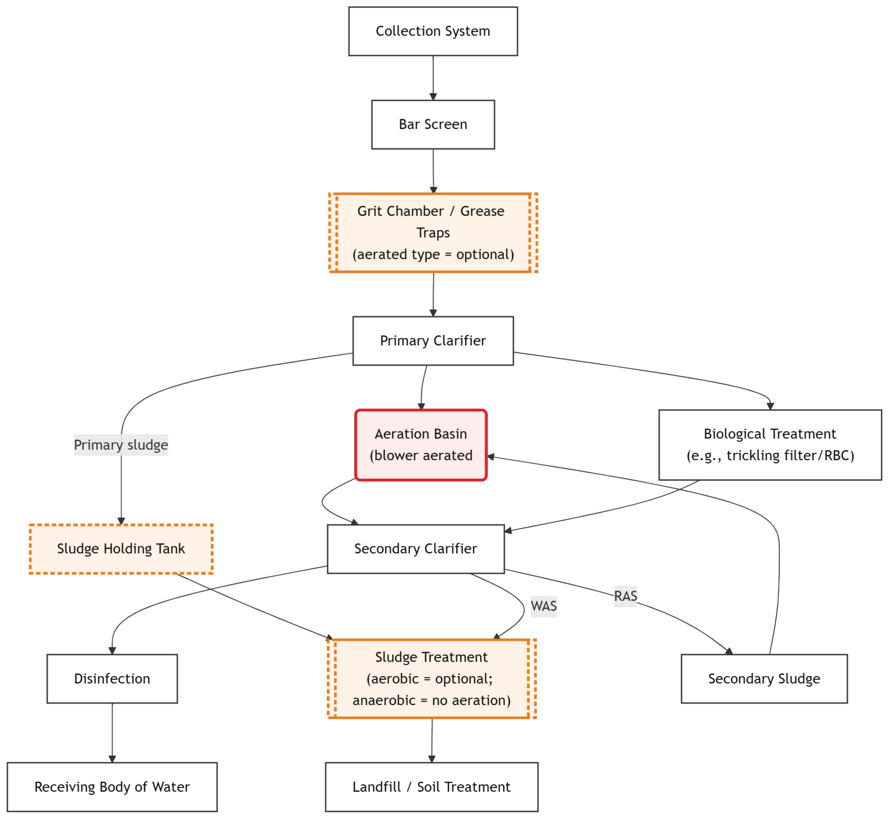 Figure 1, each of which plays a distinct role in safeguarding effluent quality and environmental protection. The preliminary treatment stage uses screens, grit chambers, and grease traps to remove large solids and inert materials. Aerated grit chambers and grease traps further enhance particle separation and minimize odors by injecting air during the process. The primary treatment phase, centered on sedimentation in clarifiers, could also include surface aeration to control scum accumulation and reduce septic conditions. In the secondary treatment, which is dominated by biological processes, aeration becomes indispensable: activated sludge systems and biological reactors rely on oxygen transfer to sustain microbial communities that degrade organic matter and nutrients. Even in the tertiary and advanced treatment stages, aeration can appear again, for instance, in nitrification–denitrification processes, polishing ponds, or advanced oxidation systems, where oxygen availability influences both chemical and biological reactions. Thus, although the aeration basin is traditionally identified as the major energy hotspot, aeration requirements are embedded across multiple treatment stages [