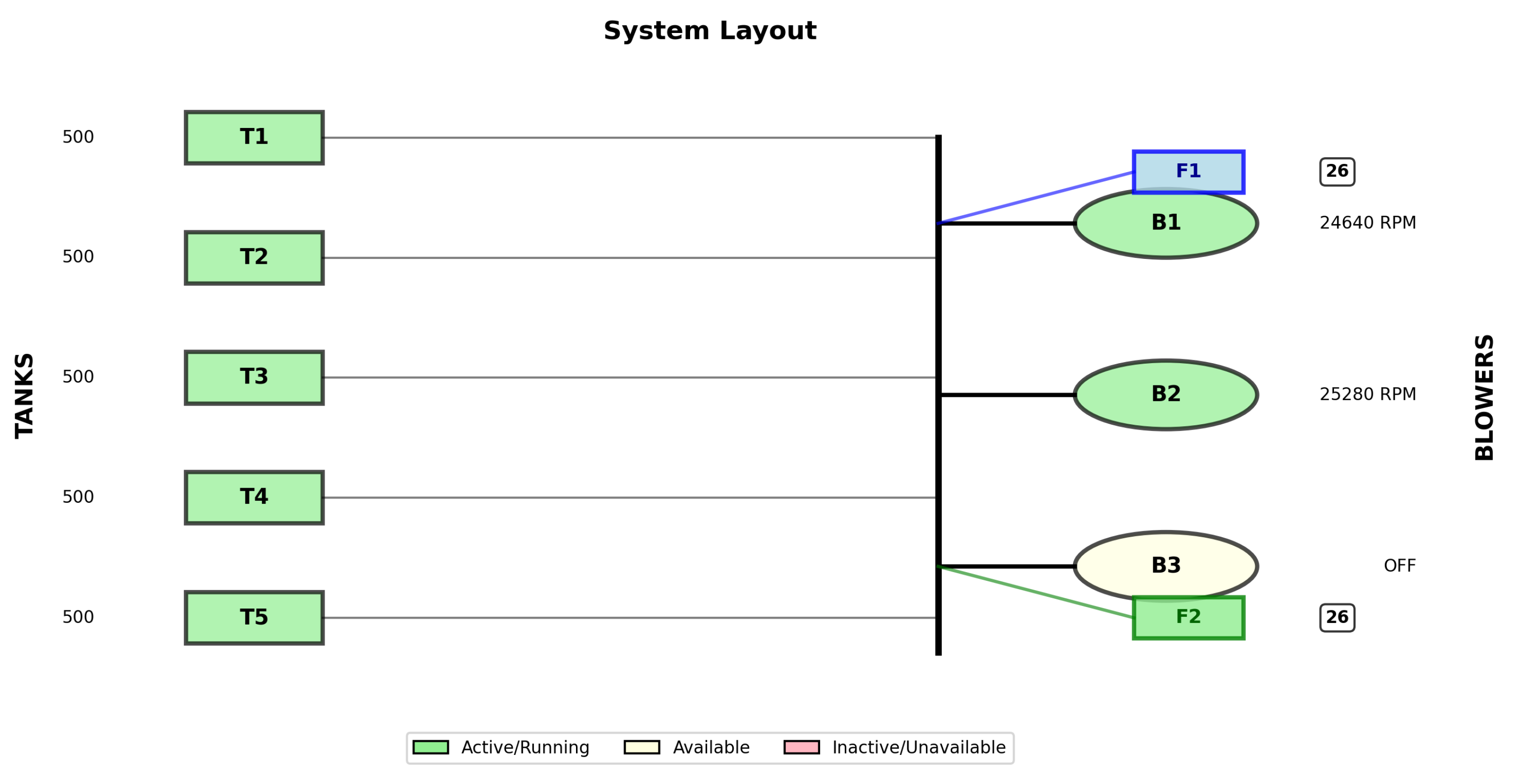 At the highest level, the proposed framework incorporates an optimization layer that coordinates blower operation and airflow distribution across the grit tanks. This layer is responsible for identifying energy-efficient set-points while ensuring that operational safety and process requirements are satisfied. The optimization problem is formulated over two categories of decision variables: (i) the on/off states of the blowers and (ii) their operating speeds, expressed as normalized speed ratios relative to nominal values. Distribution valve settings are also included, ensuring that the optimization accounts for both equipment- and network-level interactions.