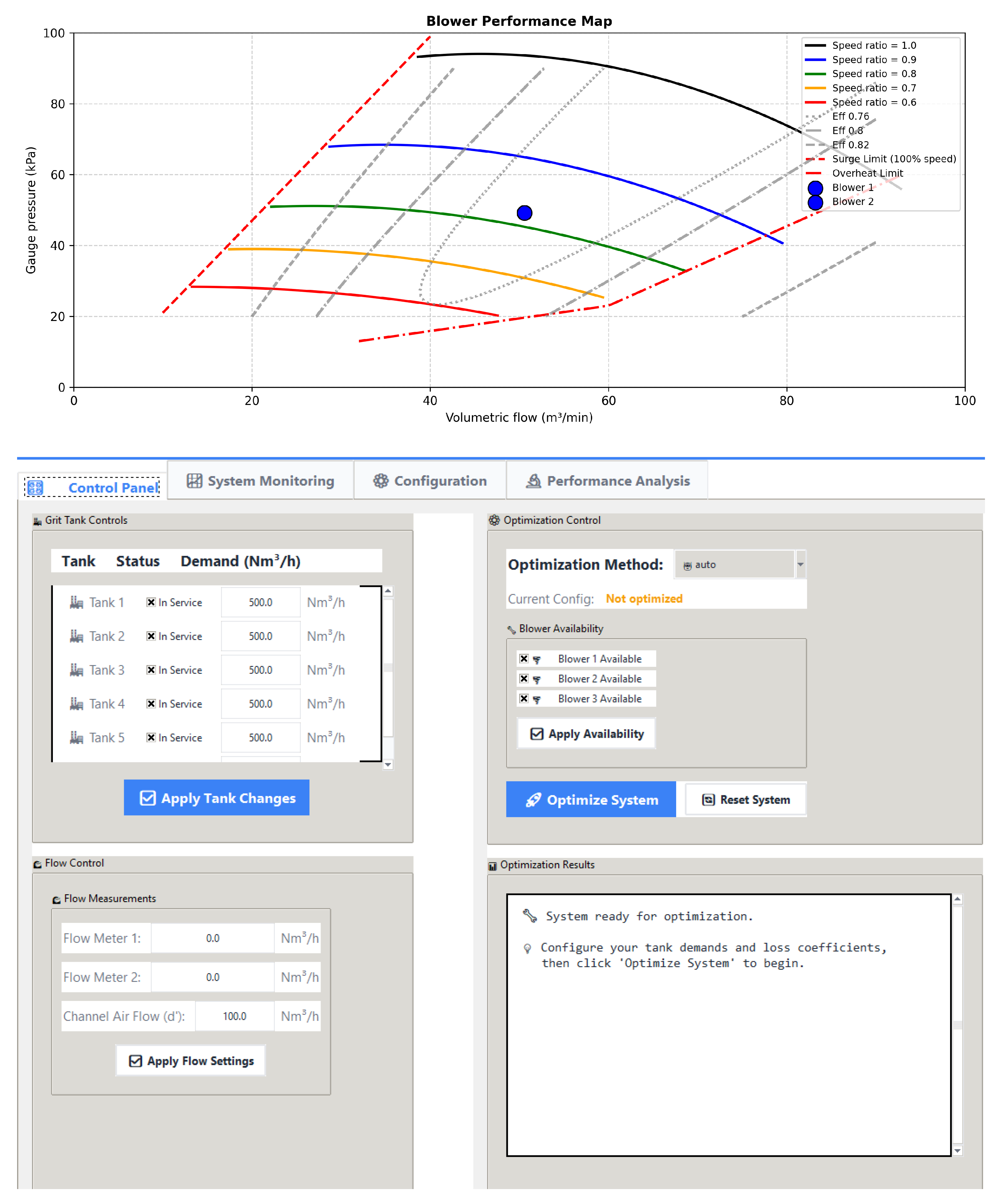 The system has been built within a Python-based simulation environment that brings together all the key components in one framework. It combines the blower performance module, based on vendor curves, with a network flow solver that uses the Darcy–Weisbach formulation to capture nonlinear pressure–flow interactions. On top of this, different optimization routines are embedded along with interfaces for visualization and data logging. A Tkinter GUI is employed to provide interactive control and deliver clear graphical output, as illustrated in