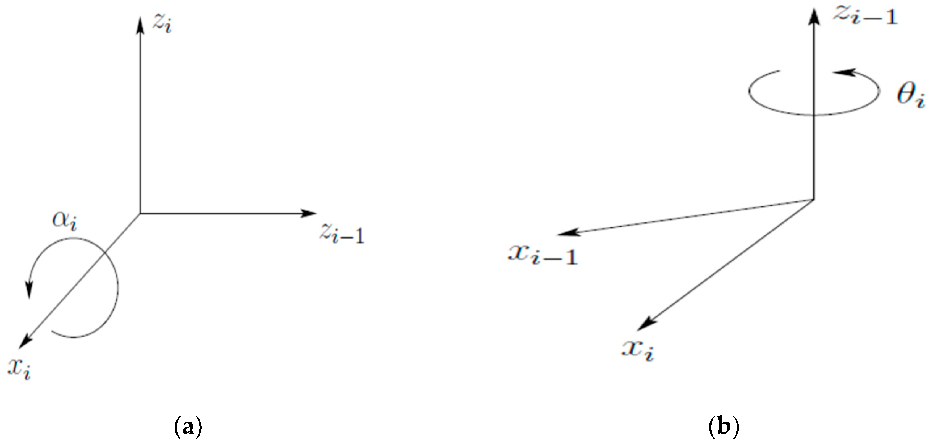 36], which allows each homogeneous transformation to be expressed as the product of four elementary transformations: a rotation and a translation along the