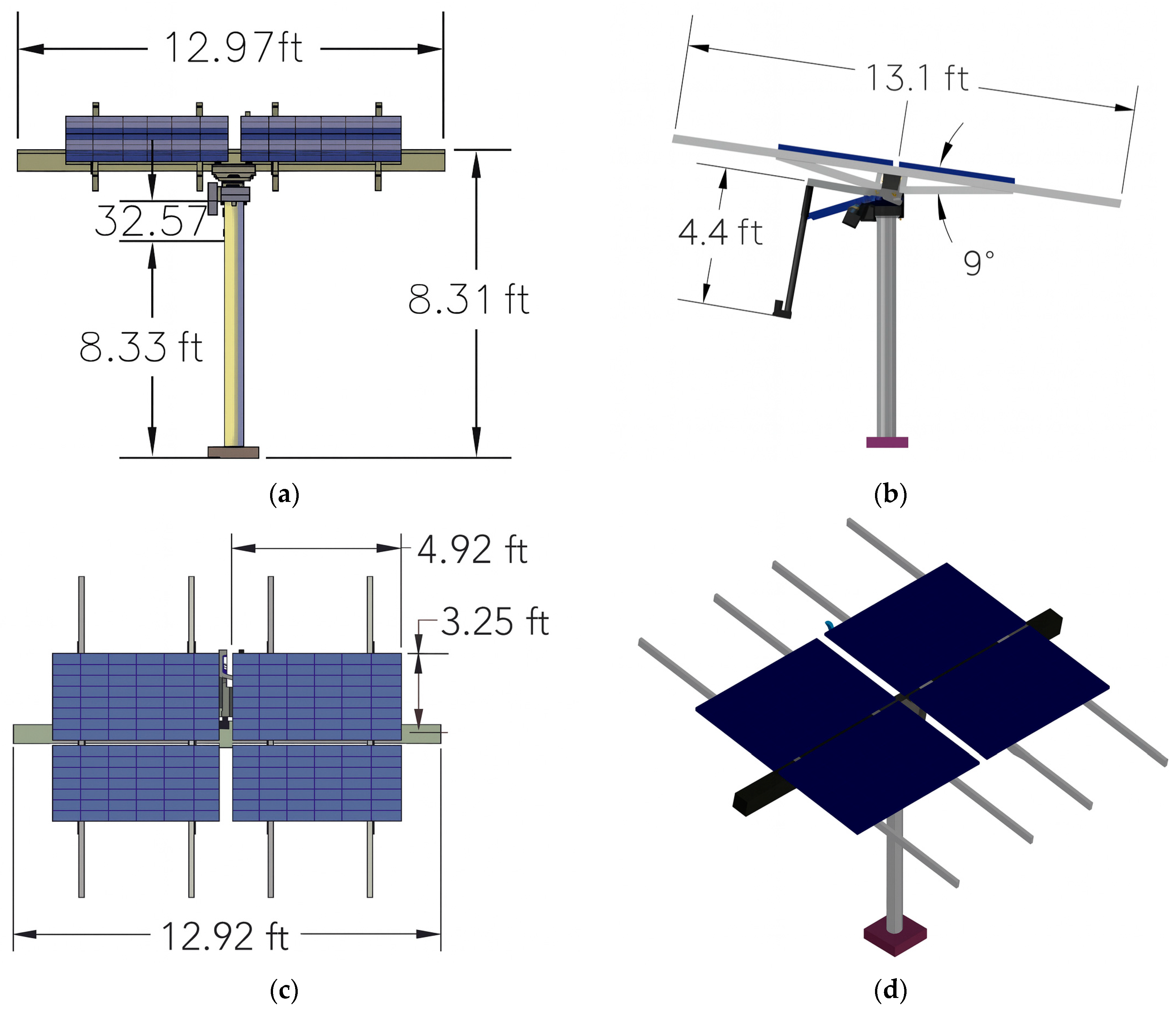 23]. Recent studies have shown that dual-axis systems can improve conversion efficiency by up to 28% compared to fixed systems and by up to 12% compared to single-axis trackers [