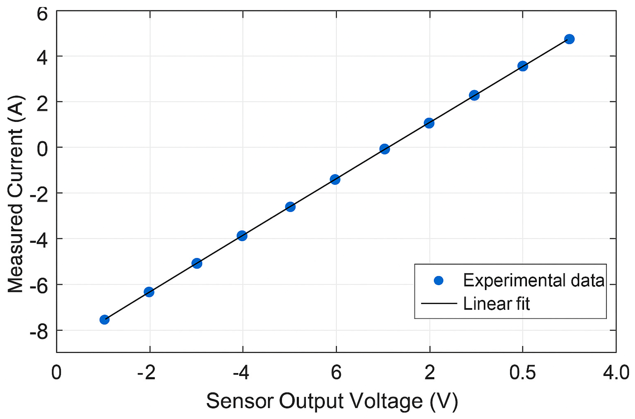 The calibration of the ACS712 current sensor and the voltage divider yielded linear responses with relative errors below 3%, as shown in
