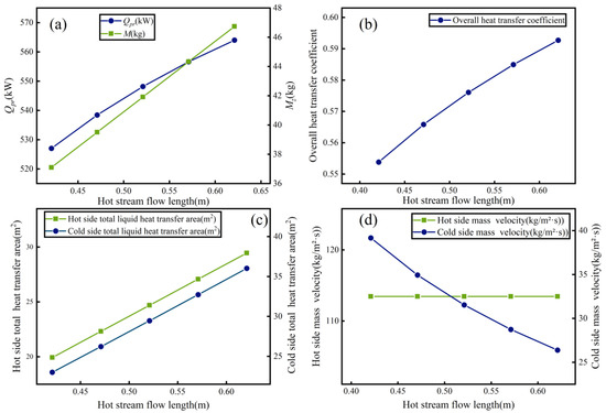 Figure 5d illustrates that, as L1 increases from 0.421 m to 0.621 m, the hot side mass velocity remains stable at 113.45 kg/m2·s. In contrast, the cold side mass velocity declines from 39.17 kg/m2·s to 26.38 kg/m2·s. This difference is attributed to the constant flow cross-sectional area on the hot side against an increased one on the cold side, while the mass flow rates remain unchanged for both streams.