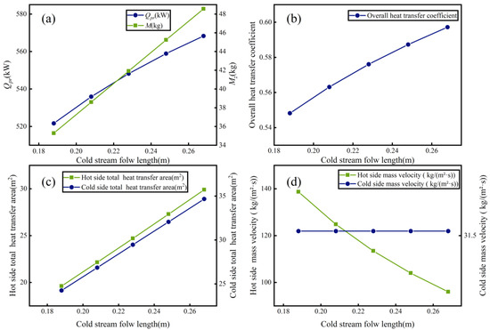 As L2 increases from 0.188 m to 0.268 m in Figure 6d, the hot side mass velocity exhibits a downward trend from 138.66 kg/m2·s to 95.99 kg/m2·s, while the cold side mass velocity remains constant at 31.53 kg/m2·s. This behavior results from the expansion of the hot side flow cross-section, whereas the cold side cross-sectional area remains constant, under constant mass flow rate conditions for both sides.