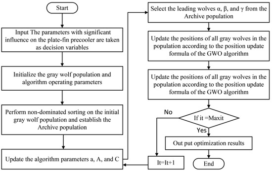 The MOGWO was selected for this study due to its distinct advantages in addressing multi-objective optimization problems of the plate fin precooler. Compared to conventional algorithms such as MOGA, NSGA-II, and MOPSO listed in Table 1, MOGWO achieves a better balance between global exploration and local exploitation by simulating the social hierarchy and hunting behavior of grey wolves, thereby effectively avoiding convergence to local optima. Moreover, MOGWO exhibits lower sensitivity to parameter settings, stronger robustness, and faster convergence speed. It efficiently obtains a well-distributed Pareto-optimal solution set under limited computational resources, thereby providing high-quality configuration schemes for precooler design.