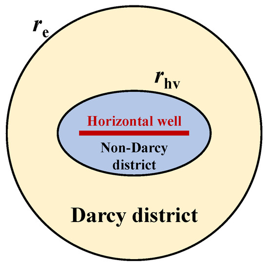 According to the relationship between pressure difference and flow rate in horizontal wells, the productivity can be calculated when and are known. Under this condition, in Darcy flow region (), the pressure equation is: