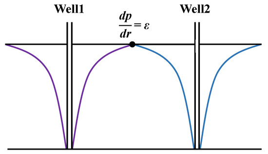 In reservoir systems, the concurrent operation of multiple wells triggers well interference phenomena, leading to dynamic reorganization of the seepage field until stabilization establishes a reconfigured pressure distribution. This redistribution adheres to the pressure drop superposition principle, where the total pressure decline at any reservoir location equals the algebraic sum of individual pressure drops induced by each well operating independently. A well is considered non-interfering when its pressure transients exert negligible influence on surrounding wells, quantified by a critical pressure gradient threshold () specific to the reservoir. The drainage radius is mathematically defined as the radial position where the pressure gradient satisfies , demarcating the boundary beyond which pressure interactions become insignificant. As depicted in Figure 4, Wells 1 and 2 exhibit zero mutual interference when their respective depletion radii remain non-overlapping, with determined through analysis of the pressure gradient field derived from reservoir pressure distribution data.