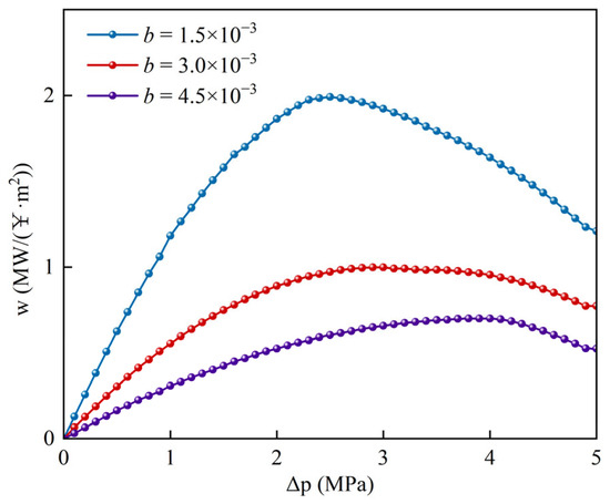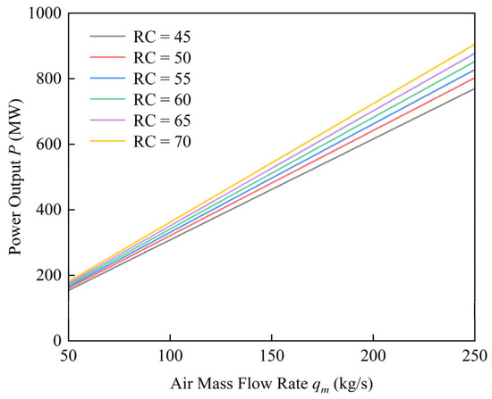 The injection–production performance of gas reservoir-based compressed air energy storage (CAES) systems is evaluated in terms of electrical energy conversion efficiency, in which the compressed air stored in the reservoir is withdrawn through wells and subsequently converted into electricity via expansion turbines. In 1998, Najjar et al. [7] developed a mathematical model that correlates the power output of surface expansion turbines with the air mass flow rate under different pressure ratios, and the corresponding parametric relationship is graphically illustrated in Figure 5.