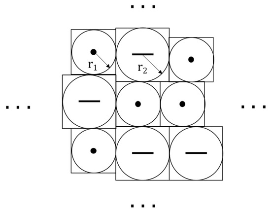If there is interference between wells, the production capacity of each well will be reduced, making the overall optimization function smaller [27,28]. In order to maximize the optimization function, the well spacing should be equal to the sum of the well release radius, that is, each well should be closely arranged within the control range. Assuming that the closed area of a gas reservoir is , there are vertical wells and horizontal wells, which are closely arranged as shown in Figure 6. Since there must be a dead gas zone when the circular control range is arranged, the actual area occupied by each well is approximately the area of a square with a side length of twice the drainage radius. Therefore, under this condition, the relationship between vertical wells and horizontal wells is: