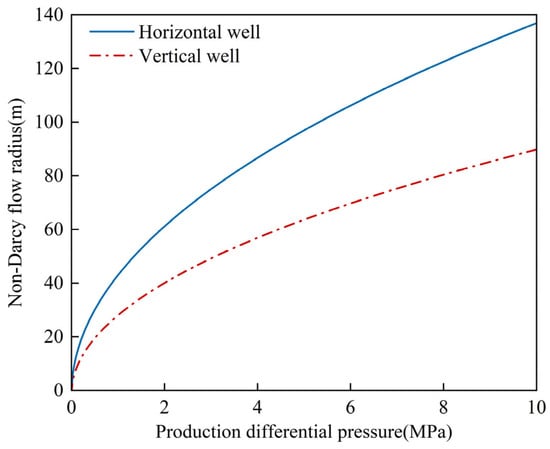 The parameter a represents the initial permeability reference value at the wellbore, and the parameter b quantifies the exponential change rate of permeability with the increase in well spacing. The two together constitute an exponential model describing reservoir heterogeneity. Then we can get non-Darcy flow radius: