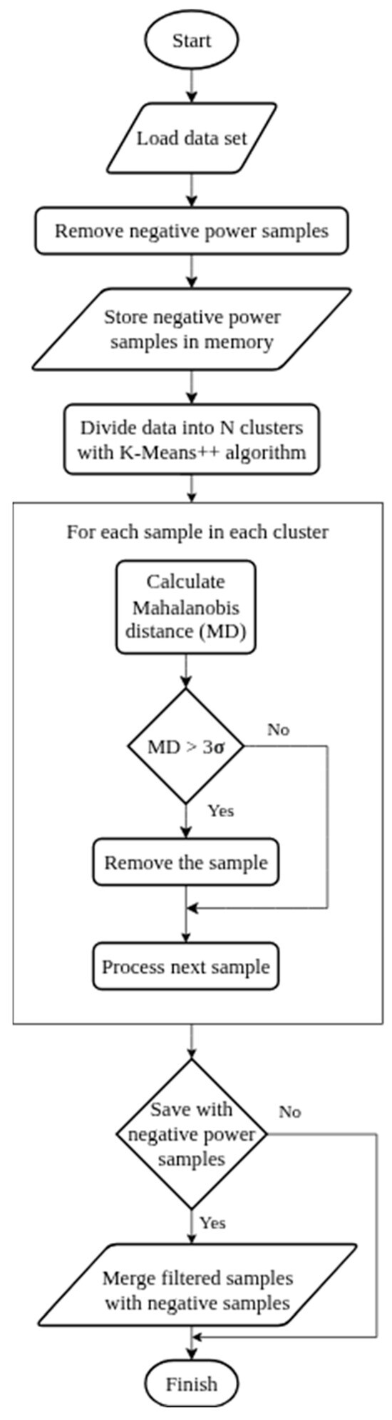 Figure 1 presents the flowchart of the cluster-based outlier removal method used to preprocess wind turbine SCADA data. The algorithm is applied separately to the dataset of each turbine in the wind farm. A key feature of the proposed approach is its flexibility in either including or excluding negative power values, enabling an in-depth investigation of how such values affect the reliability, accuracy, and effectiveness of different methods for detecting abnormal turbine behavior.