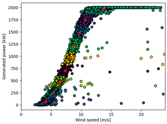 Power curve of wind turbine T07 based on SCADA data from 2017, grouped into nine clusters using the cluster-based filtering approach. Red markers indicate the centroids of each cluster.