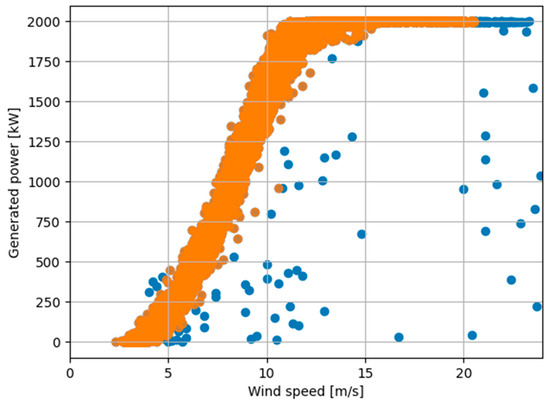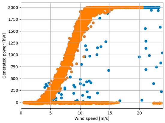 Figure 12 shows the filtered power curve of wind turbine T07 based on the 2017 SCADA dataset processed using the DBSCAN method. In this case, DBSCAN identified and removed the negative power values by classifying them as outliers. Overall, 29.01% of the data points were eliminated, which is a comparable removal rate to that achieved by the proposed cluster-based outlier filtering approach when negative power values are excluded (as illustrated in Figure 5 and Figure 6).