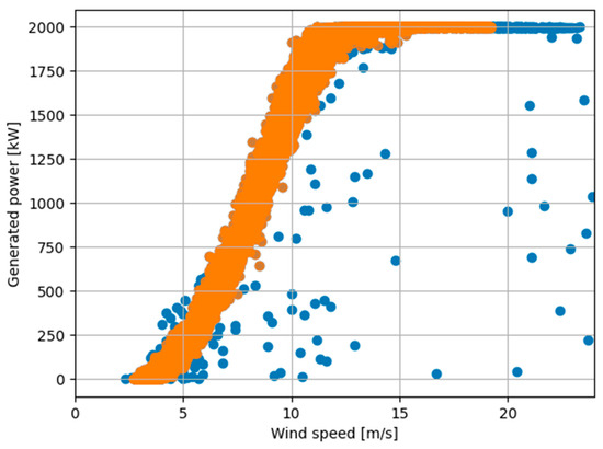 Filtered power curve for wind turbine T07 (2017 data) using the DBSCAN method with a 95% confidence threshold. Raw data are shown in blue, and the preprocessed data in orange. A total of 29.01% of the data points were removed.