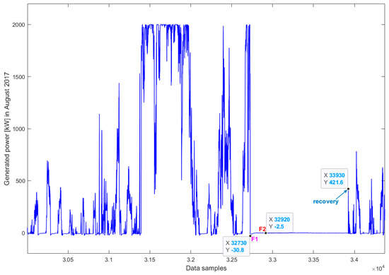 This case study examines two consecutive generator faults that occurred in wind turbine T07. The fault data were extracted from historical SCADA failure logs supplied by the wind farm operator, which include detailed timestamps of reported failures along with the corresponding turbine identifiers and affected components. The first issue (a generator bearing failure) was recorded on 20 August 2017, at 06:08 (sample 32,730). Roughly 32 h later, a second and more critical generator fault was logged on 21 August 2017, at 14:47 (sample 32,920). Figure 7 illustrates the turbine’s power output for August 2017, with clear markers indicating the failure events and the recovery point. A detailed overview of both faults, including their designated fault IDs, is shown in Table 1. Notably, the recovery of the turbine is estimated to have occurred on 28 August 2017, at 20:30 (sample 33,930), which is about 8 days and 14 h after the initial fault (F1).
