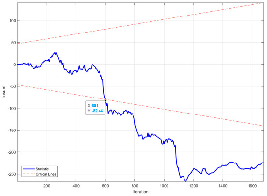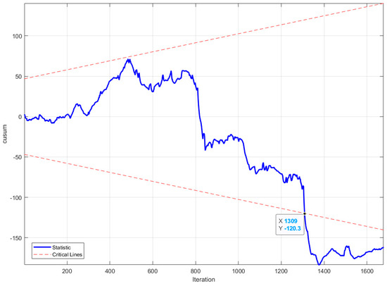 First, the results for the case including negative power values are presented in Figure 8 and Figure 9. The computation of the CUSUM test statistic (shown as the blue solid line) and the critical bounds (represented by the red dashed lines) is described in Section 4.2. As shown in Figure 8, when the outlier detection threshold was set to the 95% confidence interval (with the corresponding filtered power curve in Figure 3), the CUSUM test-based method identified the generator fault at sample 30,893. This point, calculated as T1 + 601 (i.e., 30,292 + 601), corresponds to an early detection occurring 338 h (approximately 14 days) before fault F2. However, when the outlier detection threshold was set to the 99% confidence interval (with the corresponding filtered power curve in Figure 4), the results in Figure 9 indicate that the CUSUM statistic crosses the critical region at the point 1309. This implies that the generator fault was detected at sample 31,601, calculated as T1 + 1309 (i.e., 30,292 + 1309), indicating that detection occurred 220 h (or 9 days) before fault F2. Recall that outliers were identified using 95% and 99% confidence intervals, corresponding to the removal of 5% and 1% of samples per cluster, respectively. The results show that the extent of outlier removal influences early fault detection: when only 1% of samples per cluster is excluded, the method performs worse in detecting the generator fault early compared to the case where 5% of samples are removed.