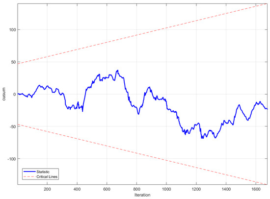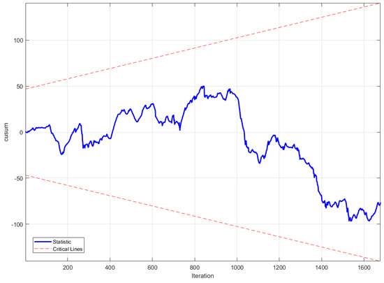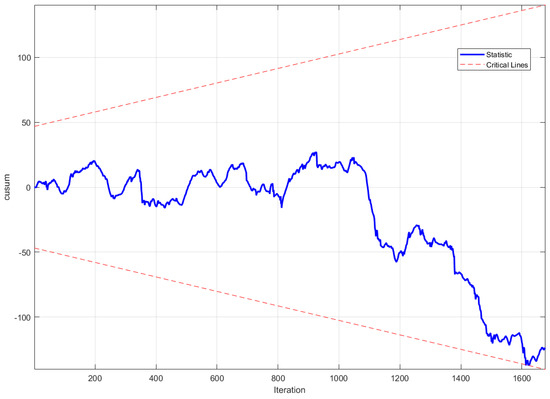 Fault detection results using the CUSUM test-based method for the case where outliers were removed with a 95% confidence interval and negative power values were included. The CUSUM test statistic is shown as the blue solid line, while the critical bounds are indicated by the red dashed lines.