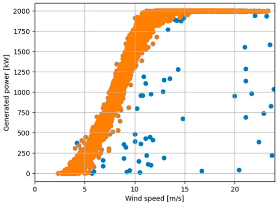 Current state-of-the-art outlier processing methods generally fall into two main categories: statistical techniques and image-based approaches. Statistical methods evaluate data based on characteristics such as mean, variance, standard deviation, Z-scores, and K-sigma rules. One of the most commonly used techniques is the Interquartile Range (IQR) method, which identifies a sample as an outlier if the sum of the third quartile and the interquartile range of the data multiplied by the factor of 1.5 is smaller than the point where the sample is defined [40]. This approach effectively filters out data points that deviate significantly from the majority, helping to improve data quality for further analysis. Another method for outlier detection is based on Chebyshev’s inequality theorem, which states that at least 88.89% of data samples lie within three standard deviations from the mean, regardless of the data distribution [41]. Therefore, any sample falling outside this range can be classified as an outlier. Unsupervised learning methods, particularly data clustering techniques, are commonly used to identify and filter out outliers. These methods include division-based clustering, density-based clustering, model-based approaches, and others [42]. Additionally, image processing techniques have been applied for outlier removal, utilizing methods such as morphological transformations, edge detection, and pixel value thresholding [43,44,45]. Advanced data processing techniques have been developed to enhance outlier detection by integrating statistical and image processing methods. In [46], the authors proposed a three-stage outlier removal approach that combines physical rule-based filtering, the random sample consensus algorithm, and IQR thresholding. The final refinement was achieved using mathematical morphological image transformations. This hybrid method demonstrated high accuracy in detecting outliers across multiple wind turbine datasets.