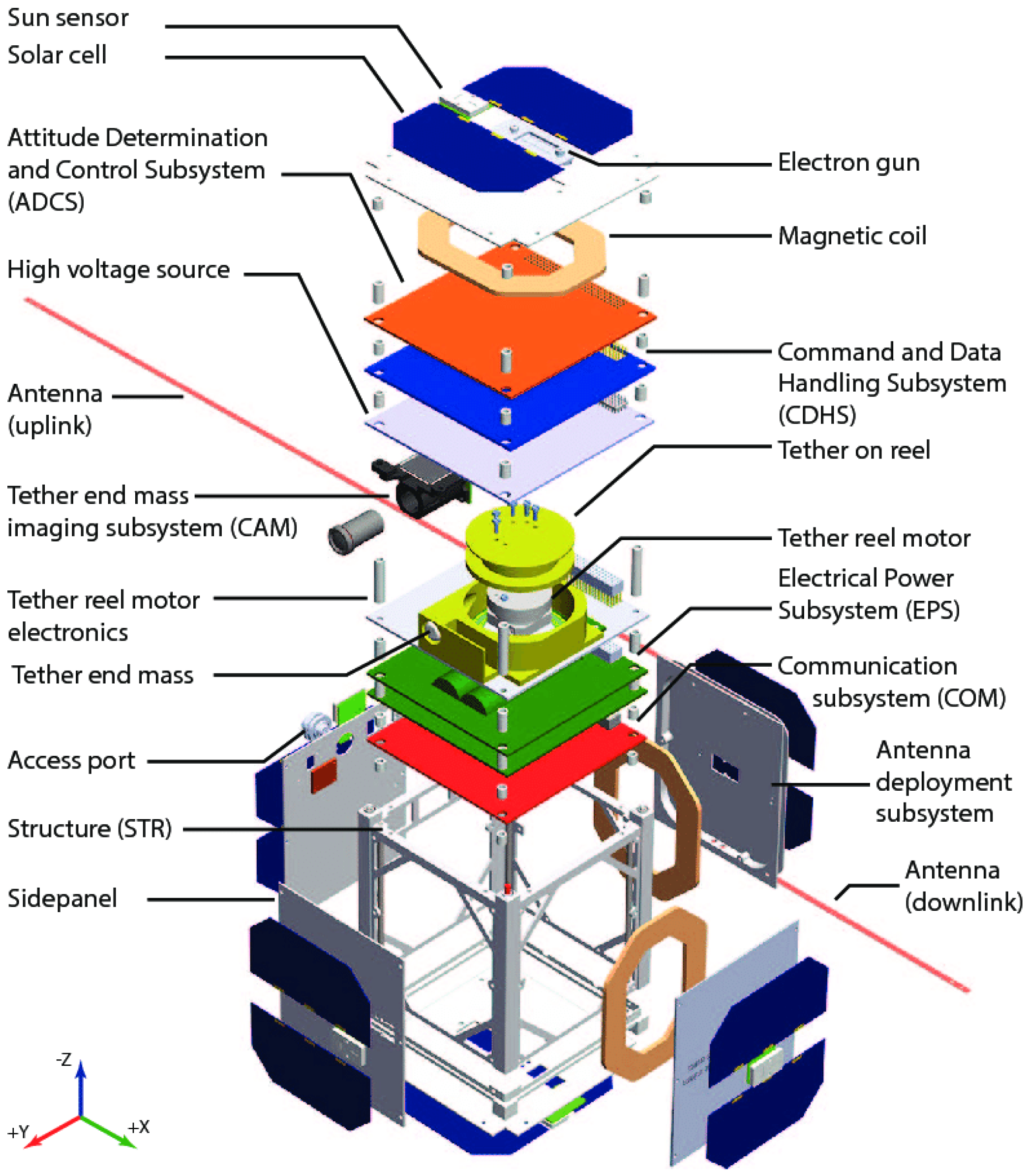 Each side is fitted with two Azur Space 3G30C solar modules connected in parallel for the CubeSat design. This configuration forms larger panels on each side. Opposite large panels are then connected in parallel to form two groups: the (+X, −X) and the (+Y, −Y) groups. The top and bottom sides are fitted with eight small Spectrolab TASC cells, which are all connected in parallel to form a (+Z, −Z) group. Each Azur Space 3G30C module outputs 2457 mV and 442.8 mA at the MPP under STCs. When two Azur Space 3G30C modules are connected in parallel on an X- or Y-configuration panel side, they collectively yield a voltage output of 2411 mV and a total current output of 885.6 mA at the MPP. The Z-configuration’s top or bottom side, with its eight Spectrolab TASC cells, provides a voltage output of 2.2 V and a total current of 112 mA at the MPP, resulting in a total of 224 mA for the (+Z, −Z) group.