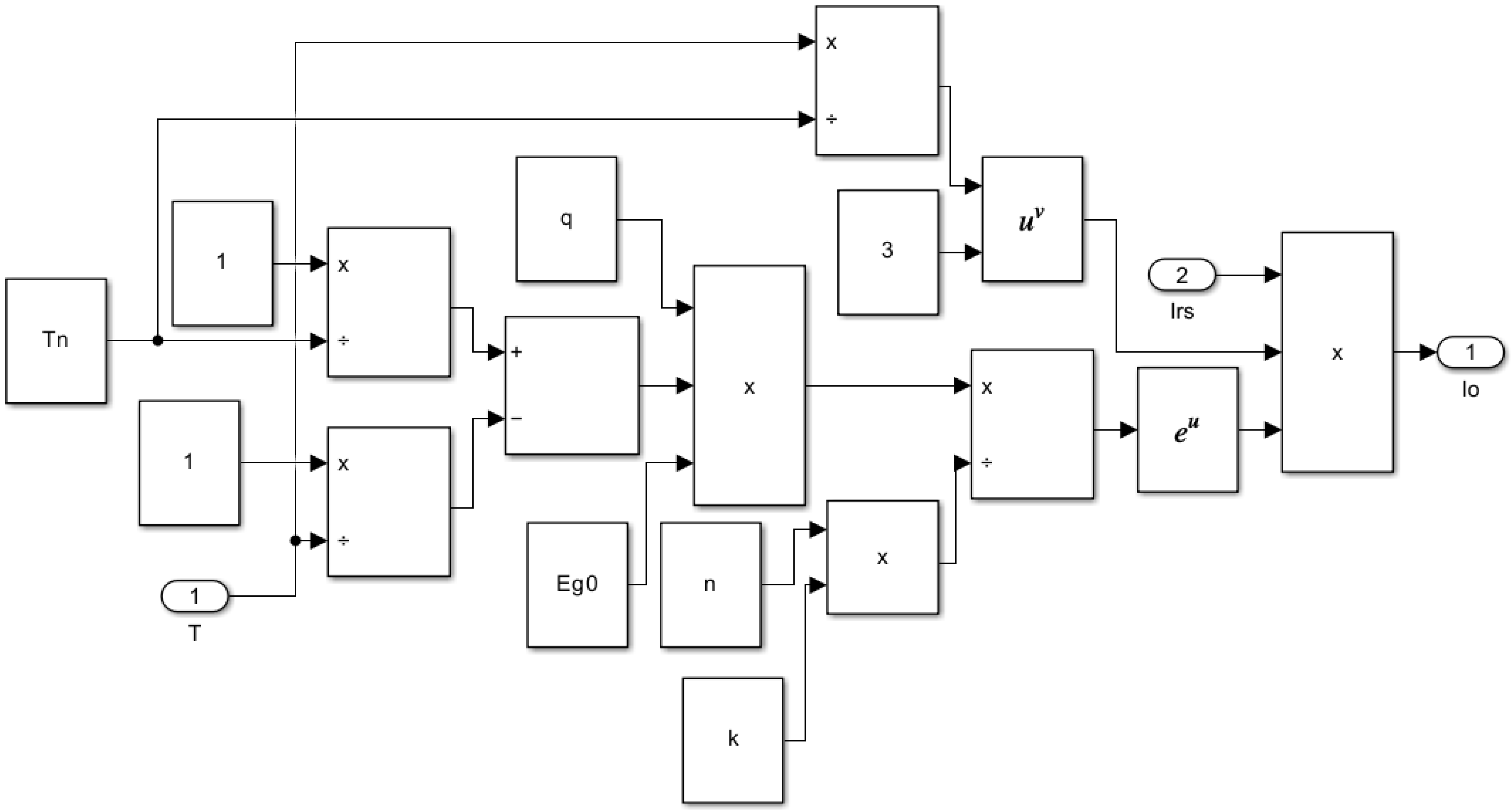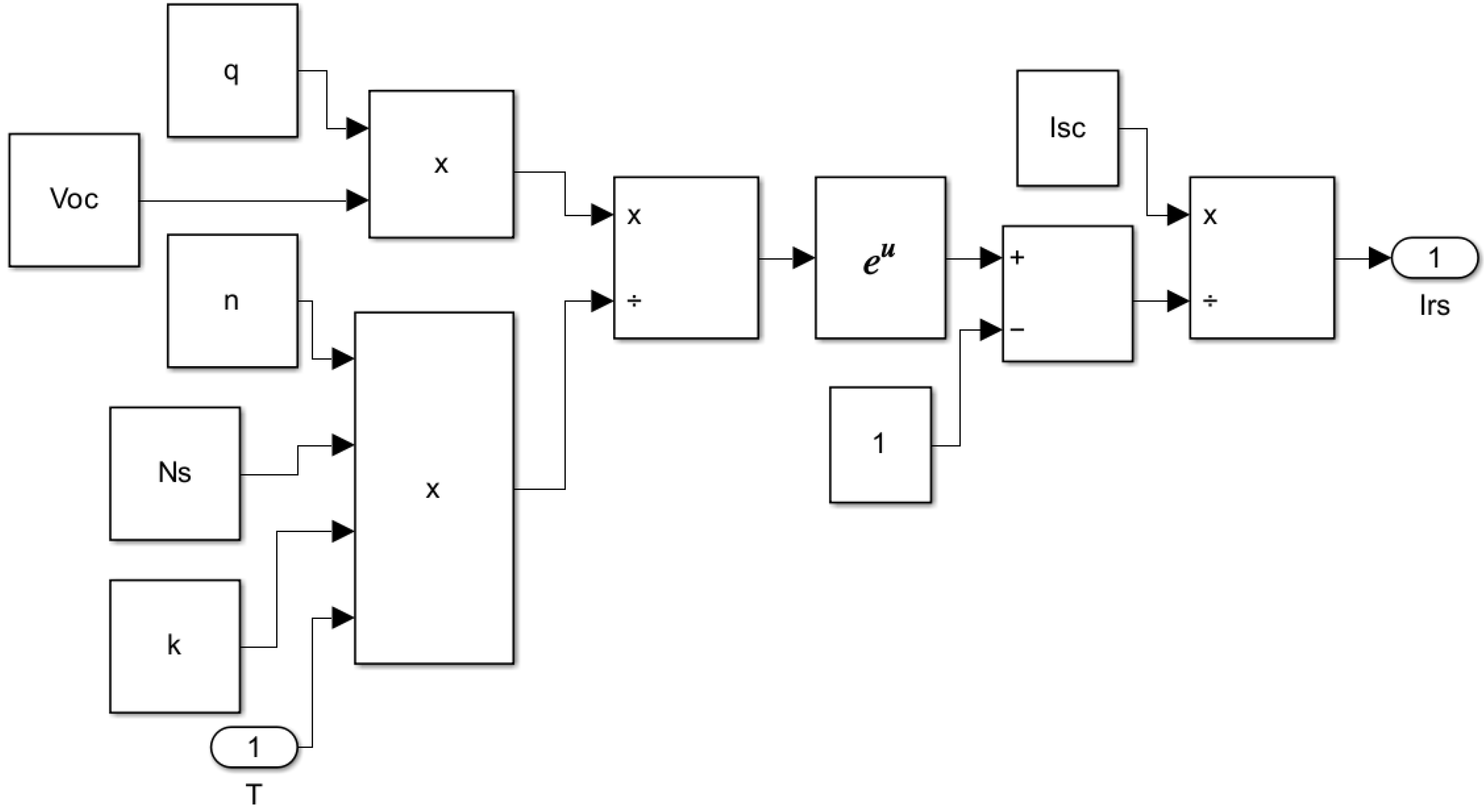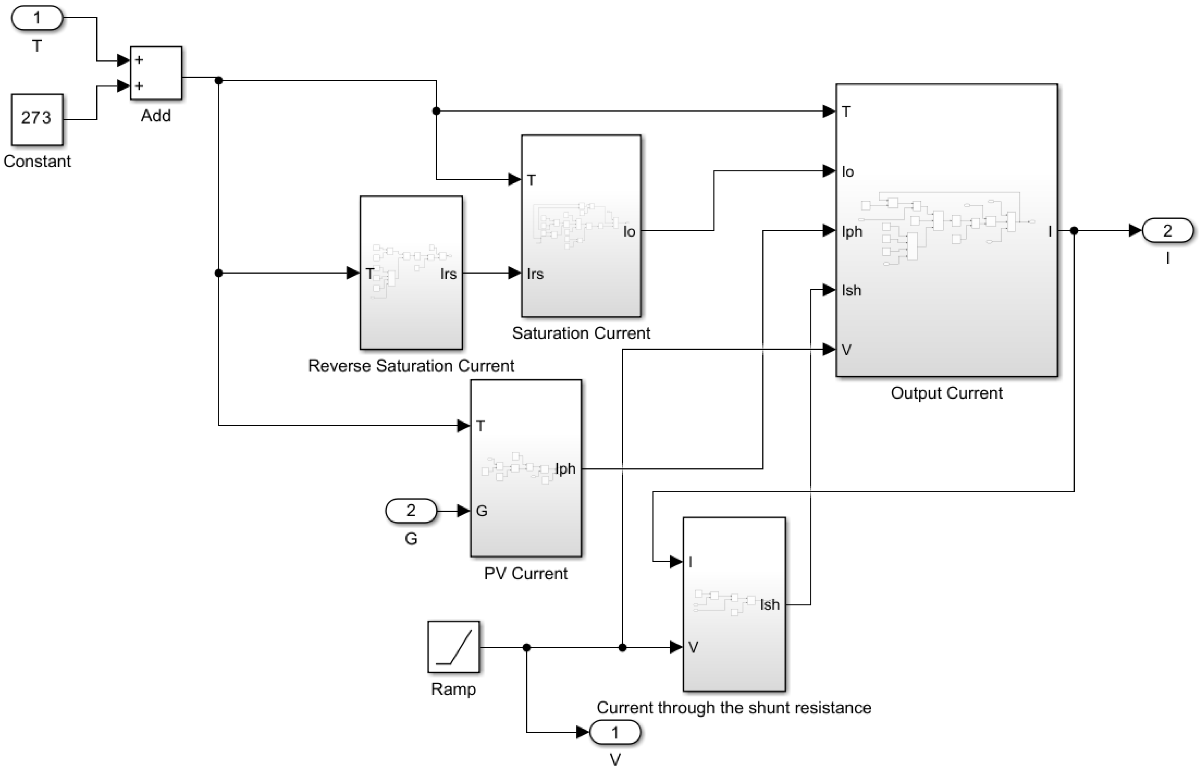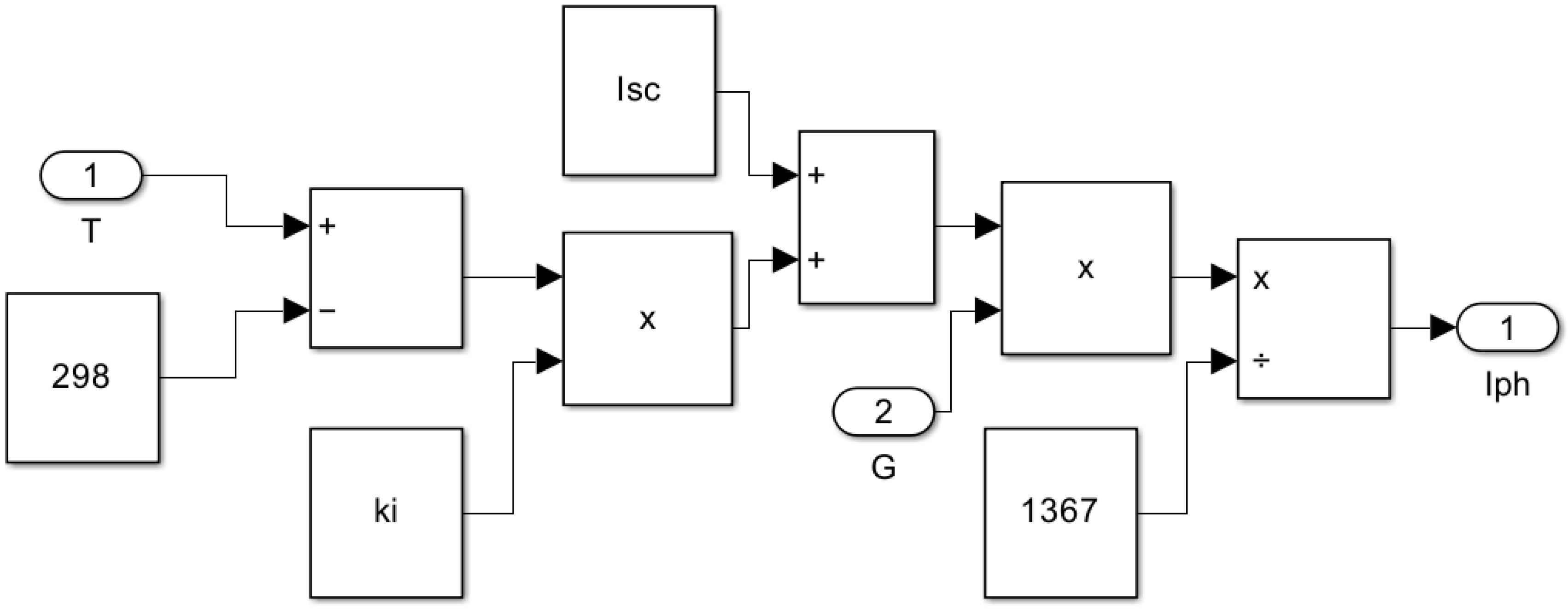 Figure 3. This subsystem inputs temperature (T) and solar irradiance (G) to calculate I