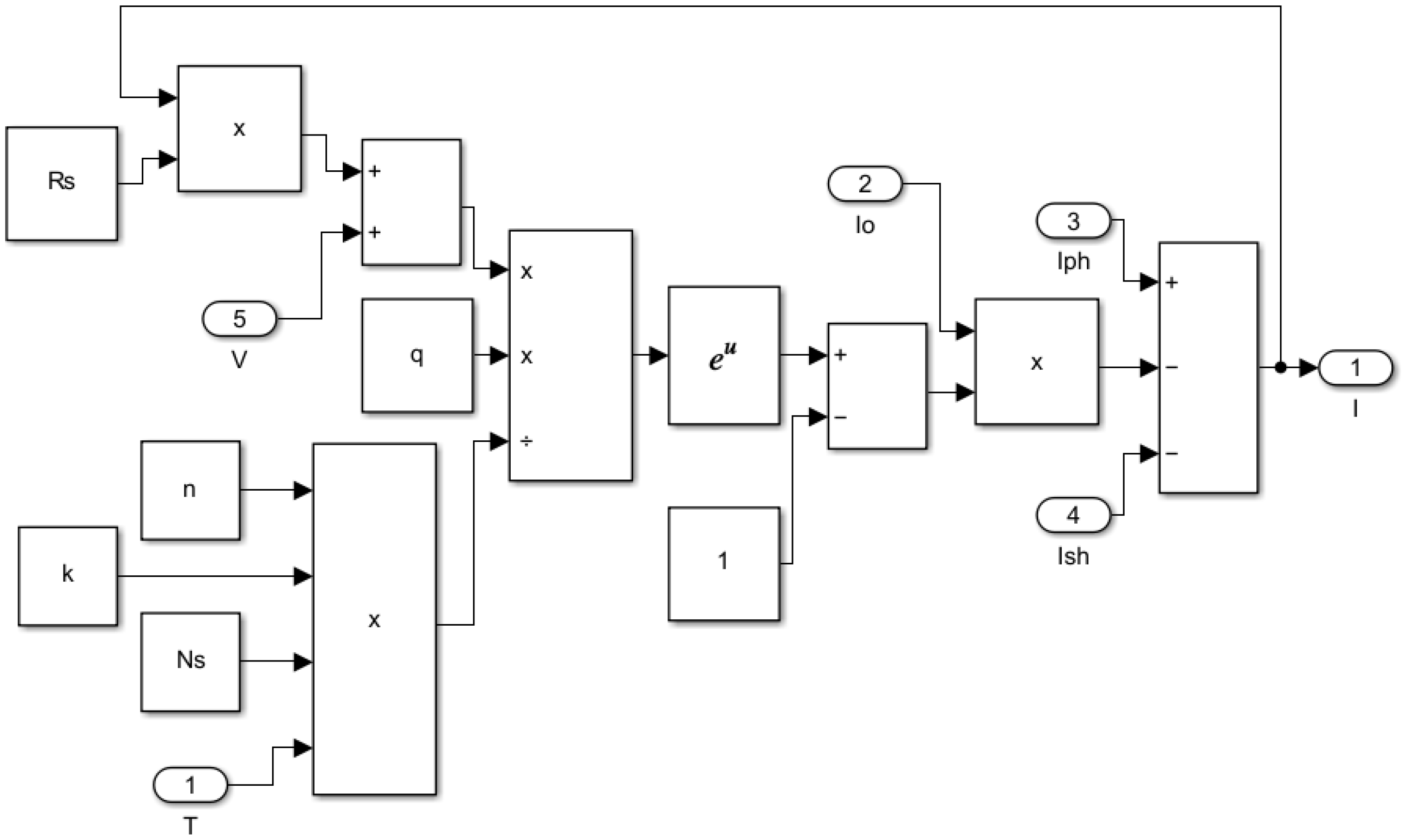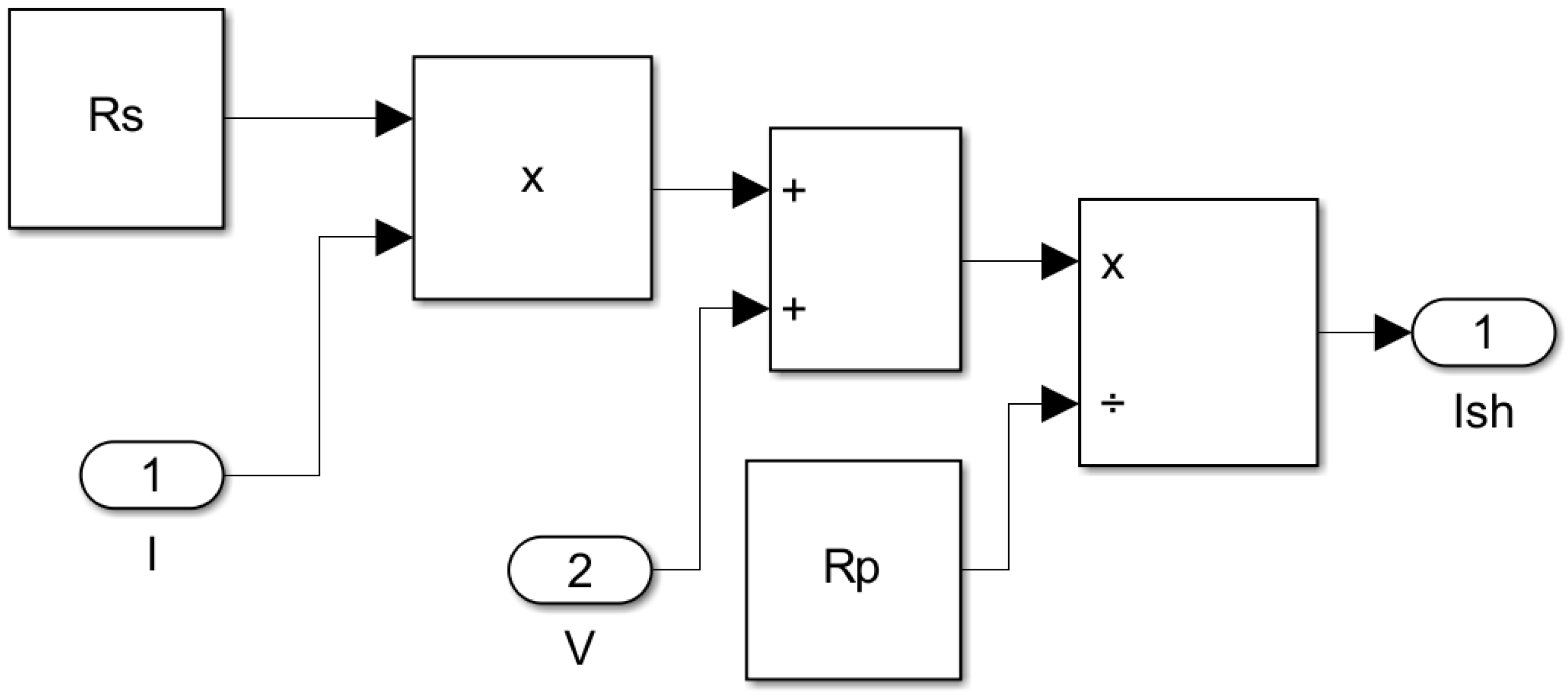 The mathematical models described above were systematically implemented in MATLAB/Simulink to create a comprehensive PV module simulation. The development process involved constructing subsystems for each of the five current equations and then integrating them into a unified PV cell model. The photocurrent model, based on Equation (2), is depicted in