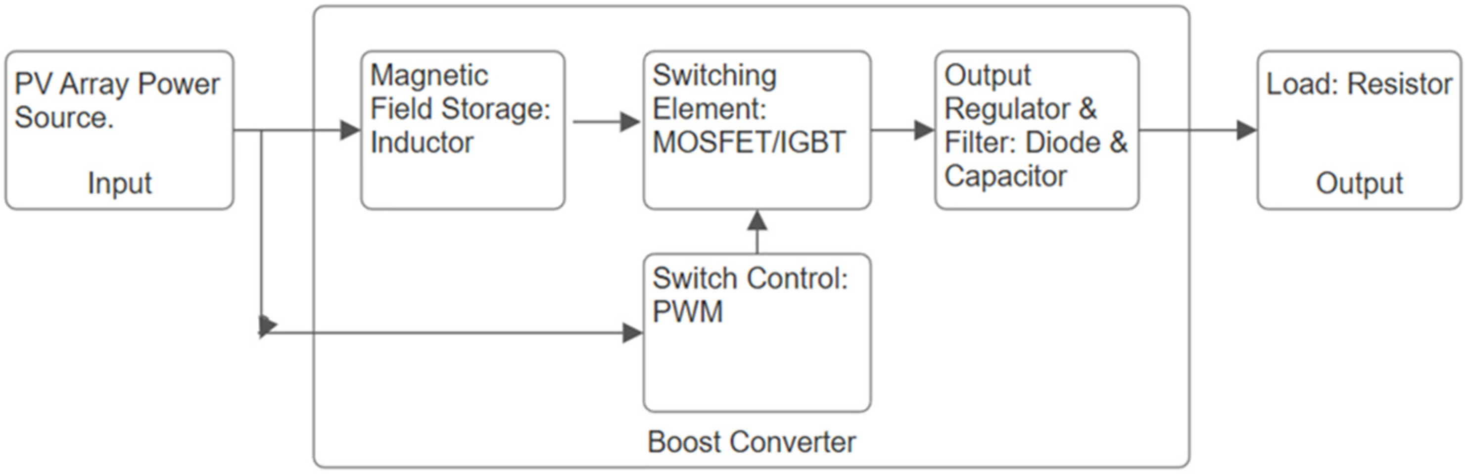 Boost converter: A boost converter was designed, modeled, and simulated to control and regulate input and output power. A key design feature was that each PV module on a panel side has its boost converter and MPPT controller, which is beneficial for single-module failures or partial shading conditions.