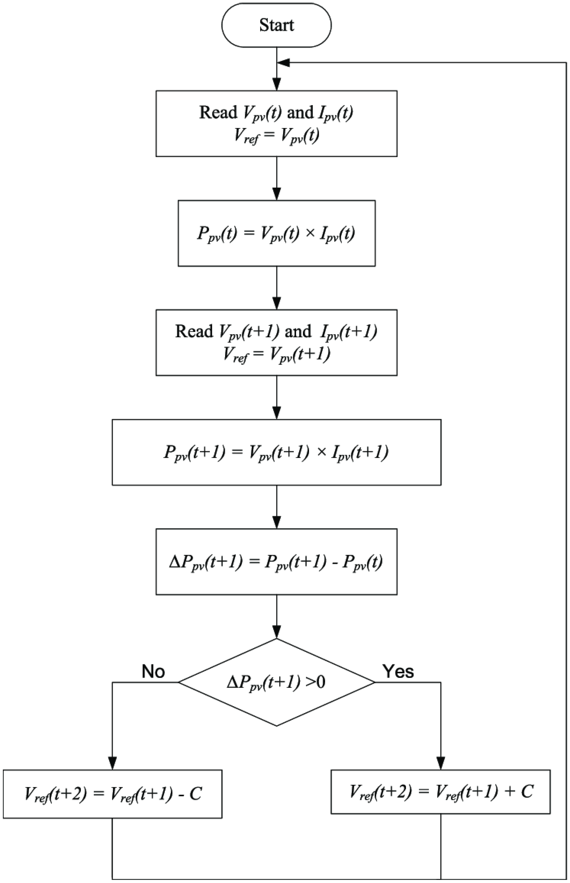 Figure 13 is the flowchart of the PO MPPT function. On the left is a negative perturbation, and on the right is a positive perturbation.