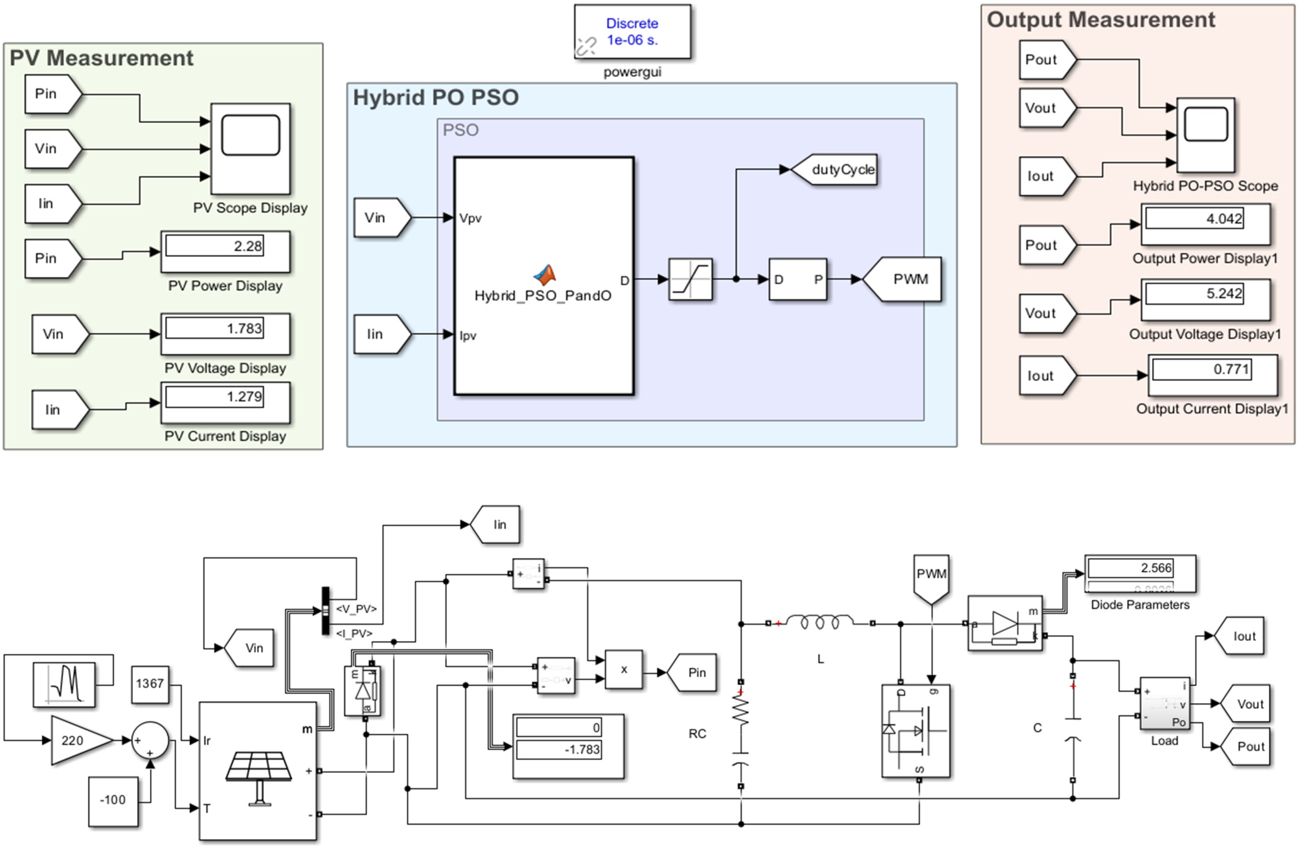 2.6. Hybrid PO-PSO MPPT Algorithm and MATLAB/Simulink Model