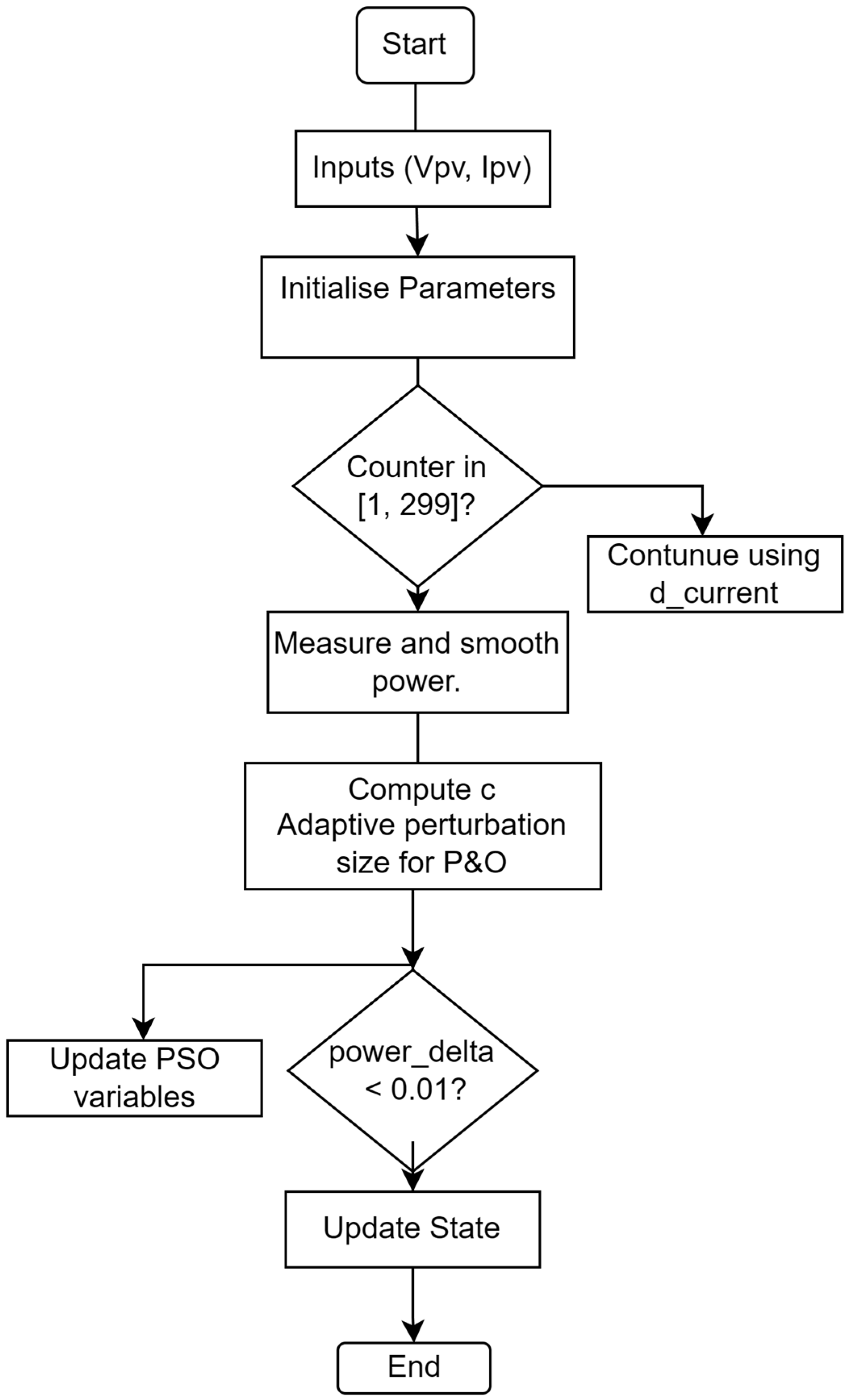 Figure 15 illustrates the flowchart of the hybrid PO-PSO MPPT function.