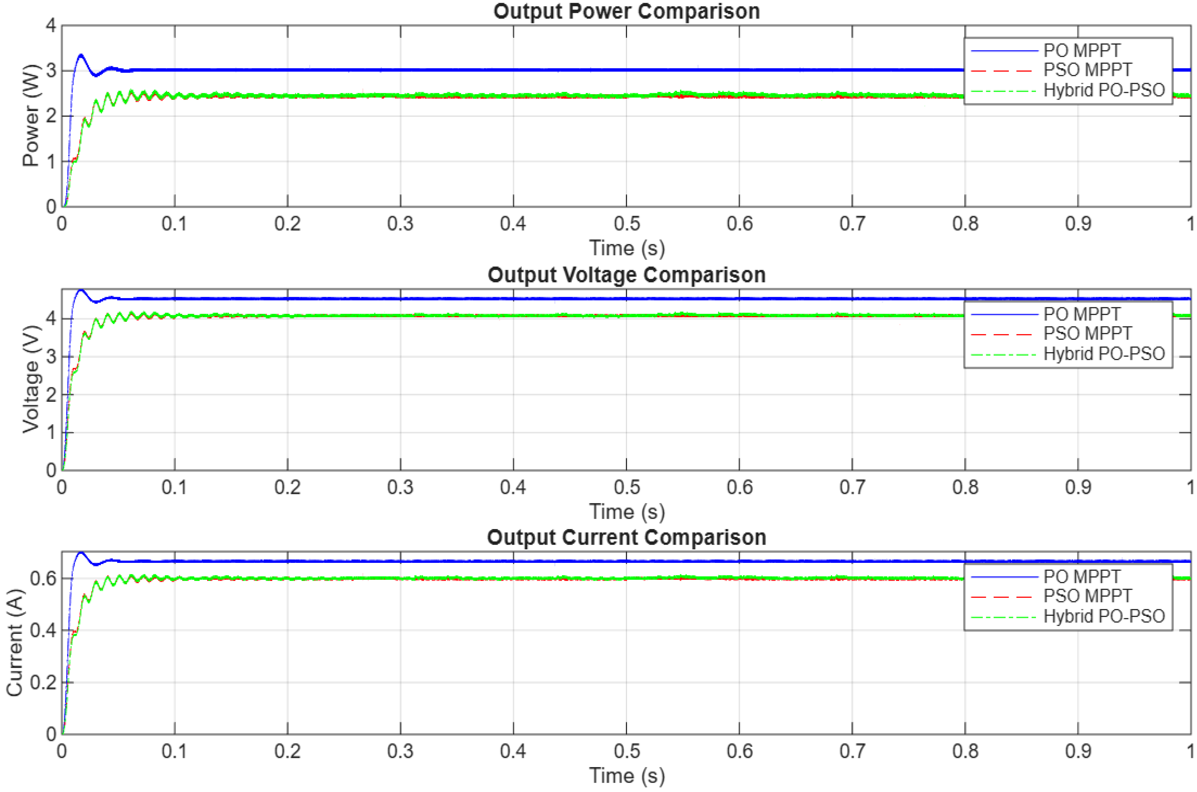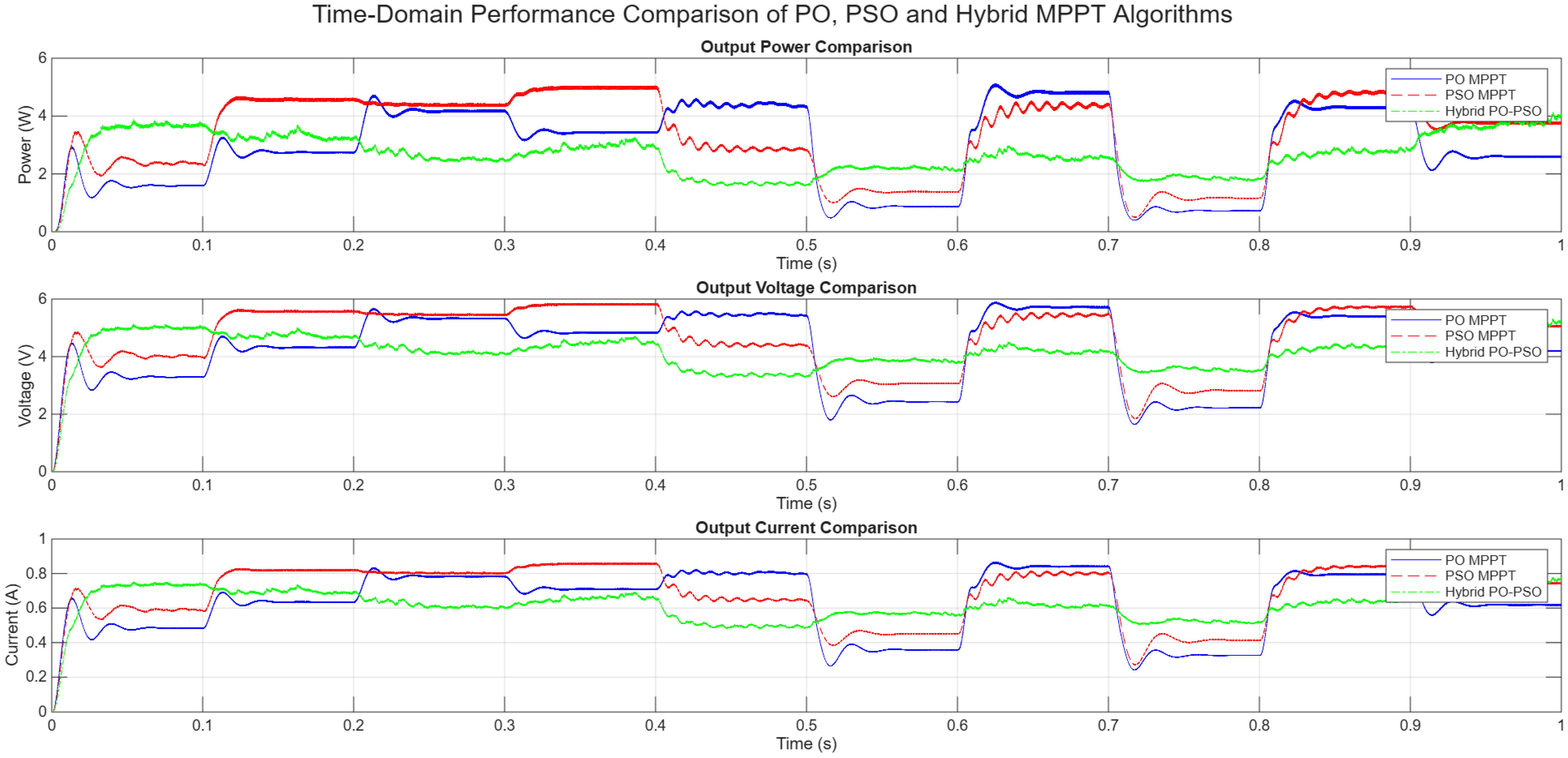 Hybrid PO-PSO MPPT: The hybrid PO-PSO MPPT consistently achieves the fastest settling time to the new GMPP following changes in conditions. Its ability to quickly identify the optimal point and then stabilize with minimal oscillations is a significant advantage, ensuring rapid adaptation to dynamic environments and maximizing energy capture during transitions.