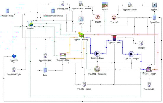 All simulations were performed using TRNSYS v. 18 software []. The main components of each model are shown in Figure 4 and included the following: