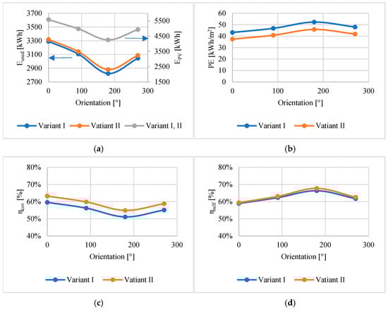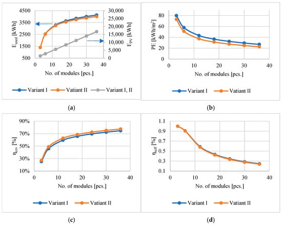 on parameters such as the amount of energy produced by the photovoltaic panels (EPV) and used by the system (Eused), the primary energy indicator (PE), the degree to which the system’s electricity demand was covered by the photovoltaic panels (ηcov), and the degree of system consumption of energy generated by photovoltaic panels (ηself).