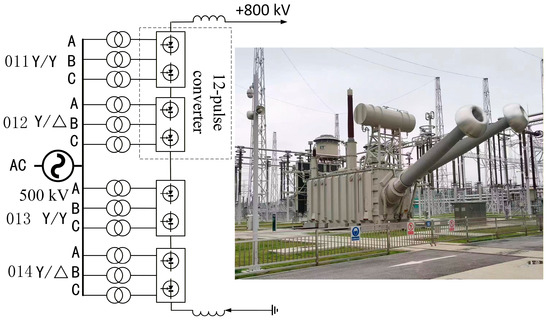 In this study, we focused on the sending terminal of a bipolar DC transmission system with a rated capacity of 8000 MW, which converts 500 kV AC to ±800 kV DC. As shown in Figure 1, there are two poles on the rectifier side (Poles 1 and 2), operating at +800 kV and −800 kV, respectively. Each pole is equipped with 12 converters. The structure of Pole 1 is also shown in Figure 1, which consists of two sets of 12-pulse converters connected in series. Each set consists of two converter transformer groups with Y/Y and Y/Δwinding connections, with models of ZZDFPZ-406000/500-800 and ZZDFPZ-406000/500-600 (TBEA Co. Ltd., Hengyang, China), respectively. Each group has three converter transformers, and the four groups in Pole 1 are labeled 011, 012, 013, and 014. The primary purpose of this connection configuration is to eliminate higher-order harmonics, particularly the 3rd order.