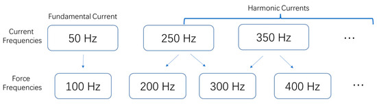 The mechanism of multi-frequency electromagnetic force generation is shown in Figure 3, where the first four orders are presented as an illustrative example. While interactions among harmonic currents can also produce electromagnetic forces (e.g., 250 Hz and 350 Hz current yielding 100 Hz forces), they were neglected in this analysis due to the significantly smaller amplitudes of higher-order harmonics. It should be noted that the fundamental current also participates in the generation of the higher order force components.