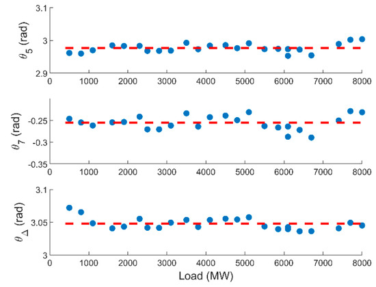The phase values (k = 1, 5, 7) and were also obtained from the current sequence, where the phase of the fundamental frequency was set as the reference ( = 0). As shown in Equations (9) and (10), these phase values serve as key parameters for calculating the electromagnetic force. The relationship between the relative phase angle and the load is shown in Figure 11. It is noted that while the proportion of the current harmonics varied with the loading level, the phase values remained relatively stable across all loading conditions. Therefore, the phase angle of the forces and the resulting winding vibrations are supposed to be insensitive to load variations under normal condition. Furthermore, since is close to π, the third term in Equation (9) has an opposite phase to the other components, leading to a reduction in the force amplitude as a result of destructive superposition.