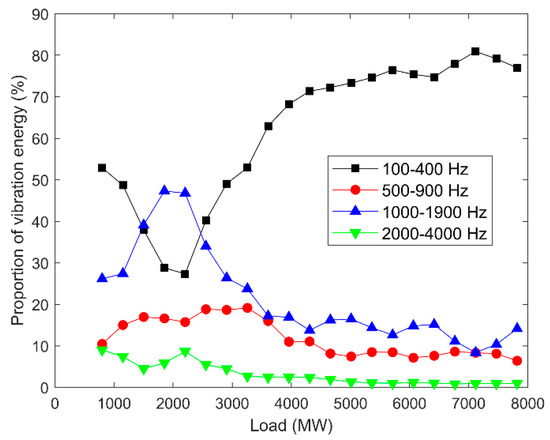 Figure 15 compares the average vibration energy proportions obtained from 72 sensors across six converter transformers. Below 2500 MW, the proportion of the 100–400 Hz band decreased with increasing load, suggesting that the winding vibration partially cancelled out the core vibration in this frequency range. Above that, the proportion of the 0–400 Hz band increased significantly. In contrast, the energy proportions of the three higher-frequency bands declined as the load increased. This trend confirms that winding vibration becomes the dominant contributor to the overall transformer vibration once the load exceeds 2500 MW.
