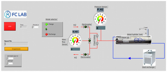 Figure 2 illustrates the LabVIEW-based system interface used for data acquisition in the experimental test bench. This interface enables real-time monitoring and control of key operational parameters, including pressure, temperature, and hydrogen flow rate. The interface includes features such as mode selection (charge/discharge), cumulative hydrogen mass tracking, and temperature regulation through the heat exchanger.