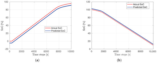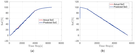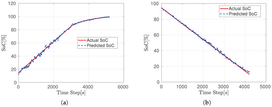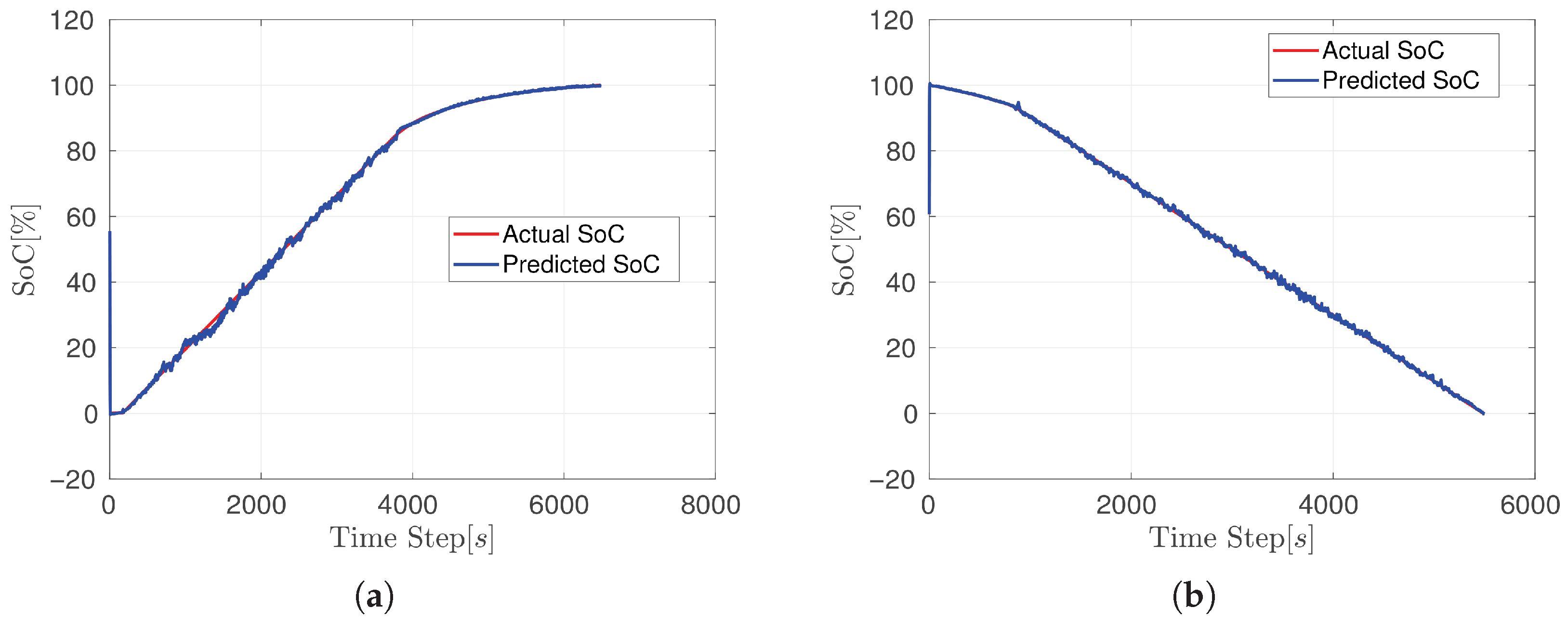 Figure 9b) cycles. Despite the sequence-based approach, the network continues to struggle with the initial SoC estimation. Nevertheless, the prediction quality improves markedly, closely tracking the actual SoC trend. Although minor noise is observed throughout the prediction, it does not significantly affect the overall prediction accuracy. With this network, the RMSE values of the charging and discharging phases are close to each other, indicating a similar prediction behavior for both phases.