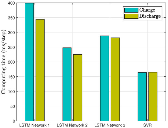 Figure 15. The three LSTM variants exhibit the highest compute times, reflecting their internal gating and memory mechanisms. Network 1, which processes the entire dataset as a single continuous sequence, incurs the greatest burden (400 ms/step during charge), whereas Network 2—employing non-overlapping fixed-length windows—achieves the lowest LSTM latency (250 ms/step) by limiting its per-batch read size. Network 3, which uses overlapping windows, falls between these extremes (290 ms/step) due to the additional cost of re-processing overlapping segments. The SVR baseline is markedly more efficient (160 ms/step), owing to its sparse support vector representation and simpler prediction rule, although with reduced capacity to model temporal dependencies. Across all architectures, charge inference is consistently marginally slower than discharge, suggesting that absorption-phase inputs impose slightly greater computational overhead.
