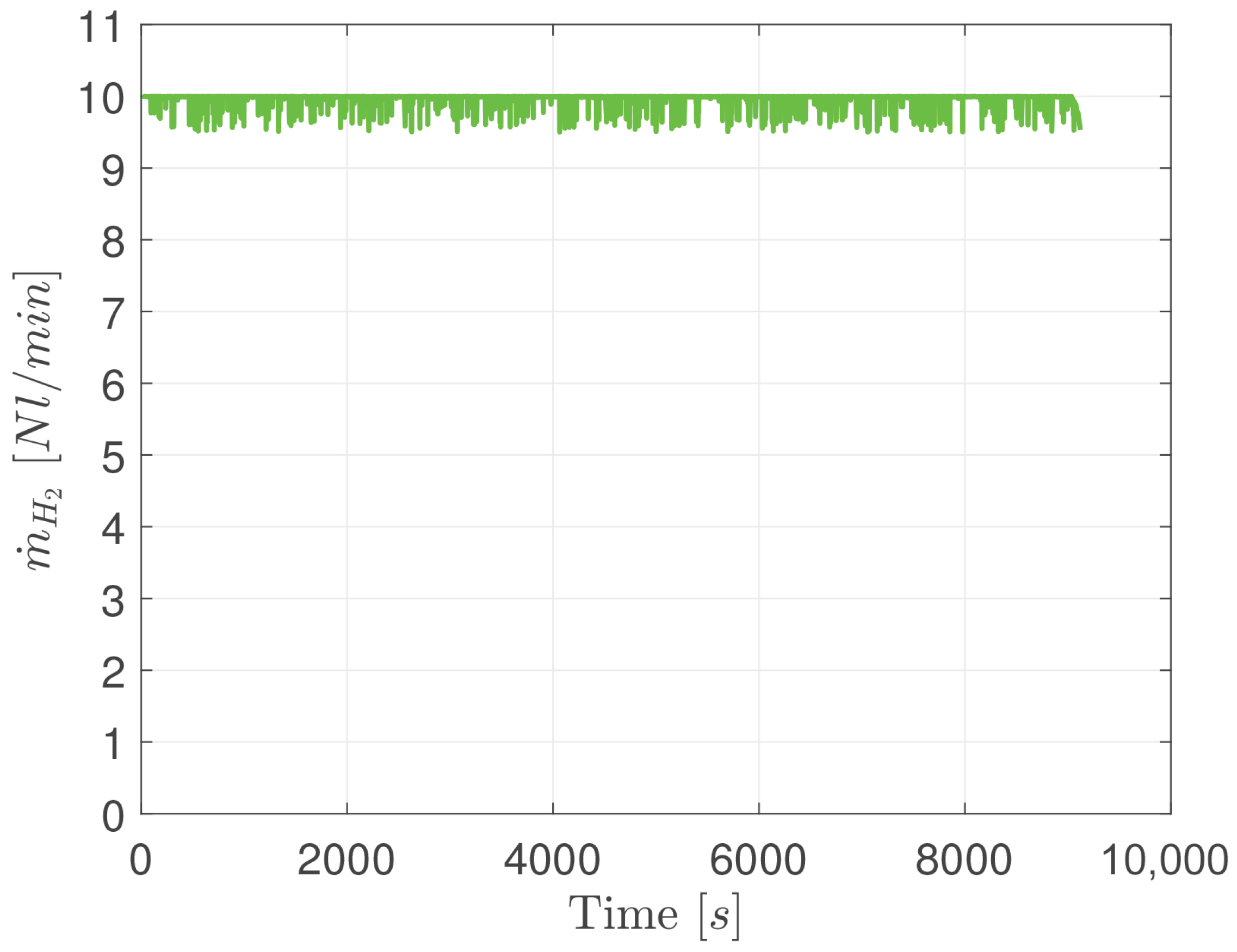 is determined using the relationship between the molar flow rate, the volumetric flow rate and the mass flow rate of hydrogen as follows [