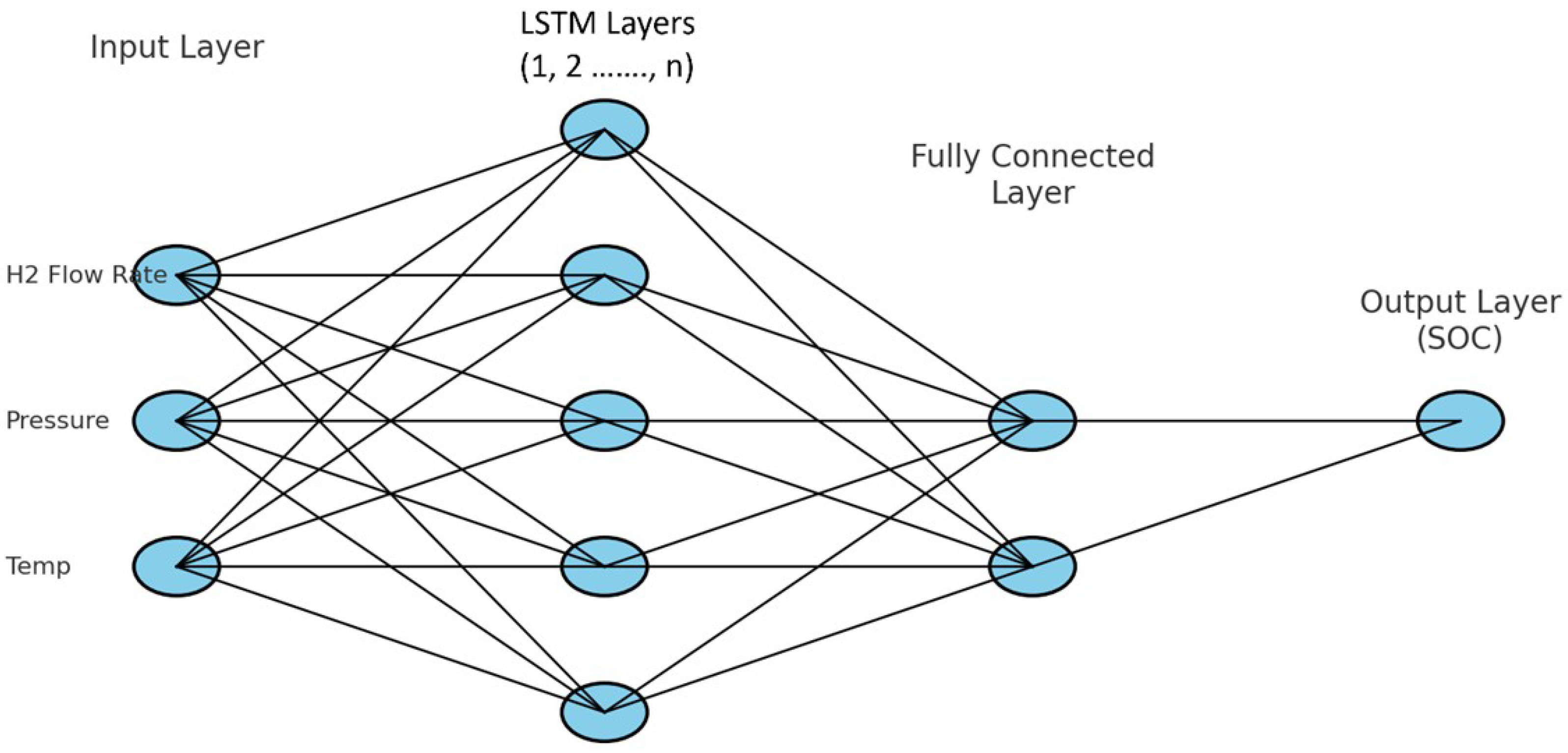 Figure 5. The model takes three input features, temperature, pressure, and hydrogen flow rate, which are passed through one or more LSTM layers (depending on the strategy employed to handle the input data). The output of the final LSTM layer is processed through a fully connected layer to generate the predicted SoC at each time step.