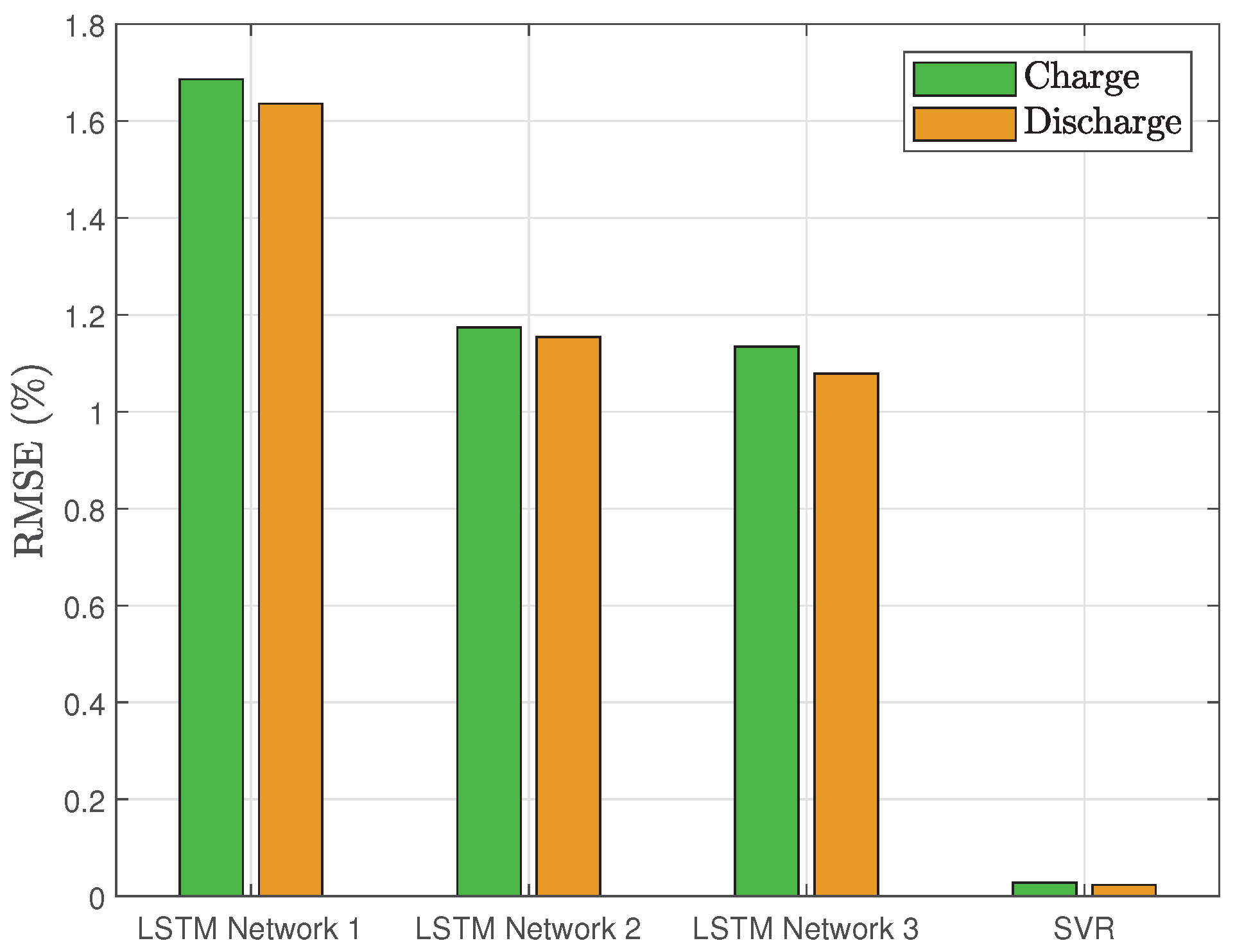 Figure 14 provides a consolidated comparison of SoC estimation performance across all methods, serving as a final synthesis of the preceding results. As shown, the SVR model consistently achieves the lowest RMSE, confirming its superior accuracy in both charge and discharge phases. Among the LSTM variants, Networks 2 and 3 deliver closely matched, substantially lower RMSE values than Network 1, which records the highest error. This summary plot thereby reinforces the earlier observations and highlights the relative merits of each approach.