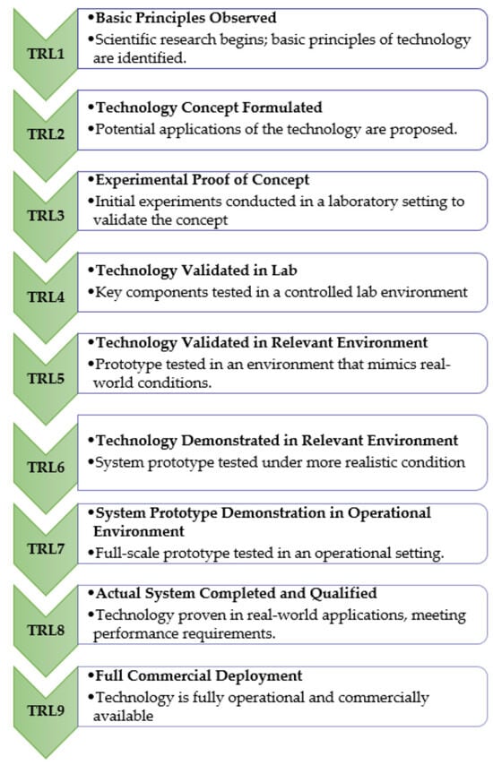 The TRL system is a nine-point scale ranging from basic scientific principles (TRL 1) to proven operational deployment (TRL 9). Each level reflects increasing fidelity and complexity. TRLs 1–4 covers concept validation in analytical or laboratory settings, TRLs 5–7 includes prototype demonstrations in relevant environments, and TRLs 8–9 represents full-scale operational use, as shown in Figure 1. Using this standardized scale helps stakeholders, developers, regulators, and investors align expectations, manage risks, and allocate resources effectively throughout the innovation process [].