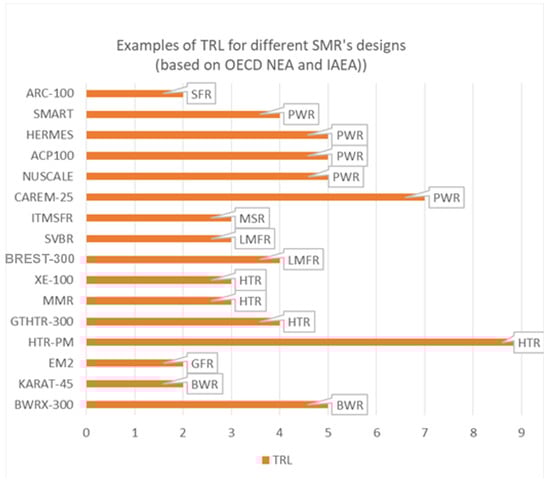 An interesting supplement to the previously discussed PNNL report is the publication ranking the proposed SMR solutions according to their status on the TRL and power scale [,]. Selected SMRs at TRLs 5 are presented in Table 3.